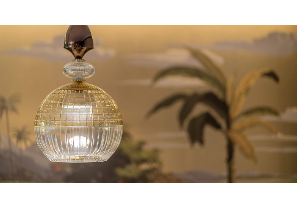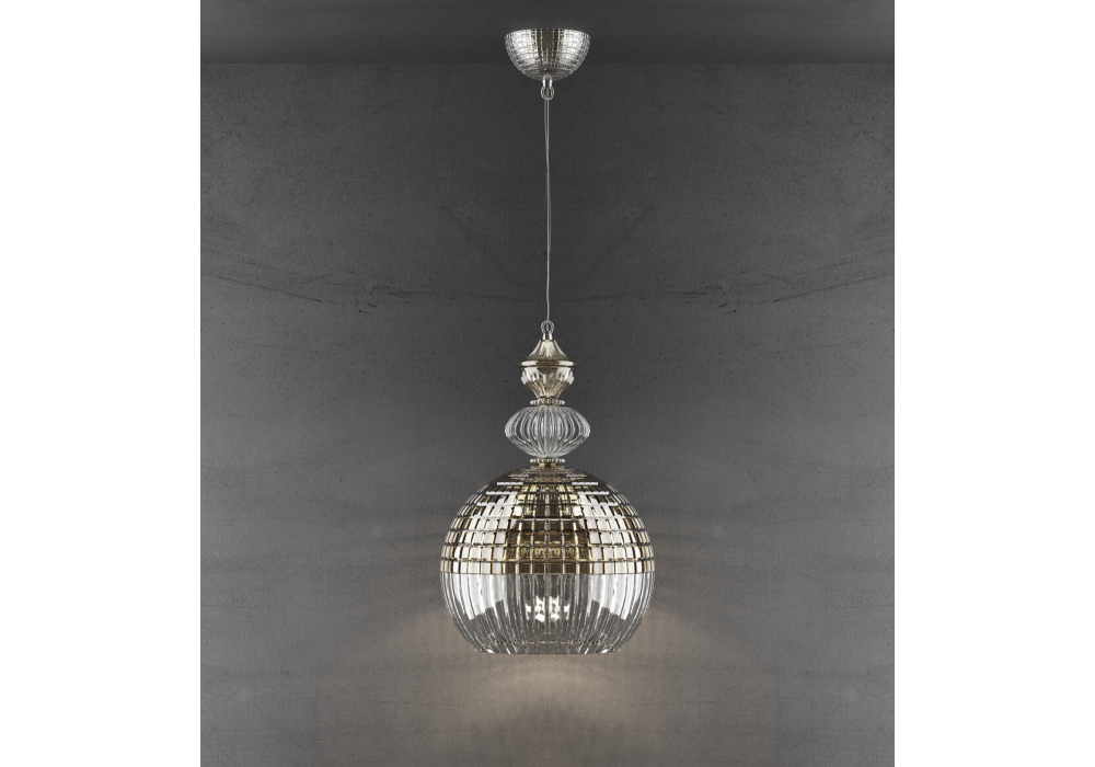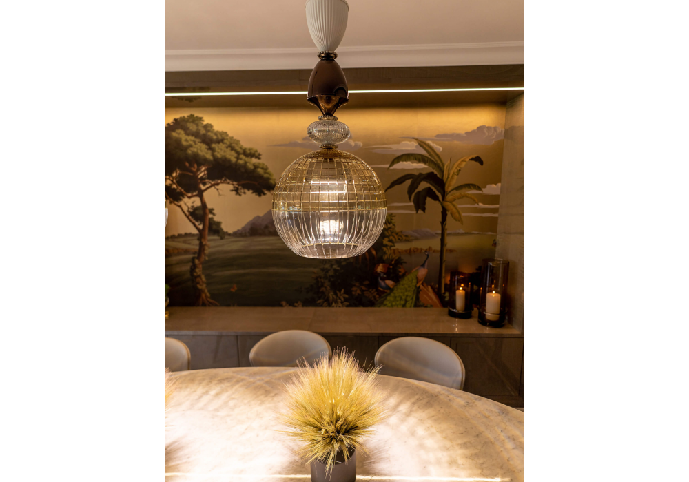 Amelie diseñada y producida por Italamp es una lámpara de suspensión con estructura metálica. Difusor y detalles en cristal tallado transparente y teca.