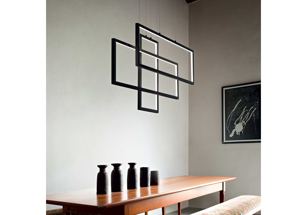 Frame diseñada y producida por Ideal Lux es una lámpara de suspensión con estructura portante de forma cuadrangular y estructura portante de metal pintado en pantalla mate. Las suspensiones están fabricadas en aluminio con diferentes formas geométricas con difusores de plástico y apantallamiento de las fuentes de luz LED. El marco está disponible en diferentes acabados y modelos.