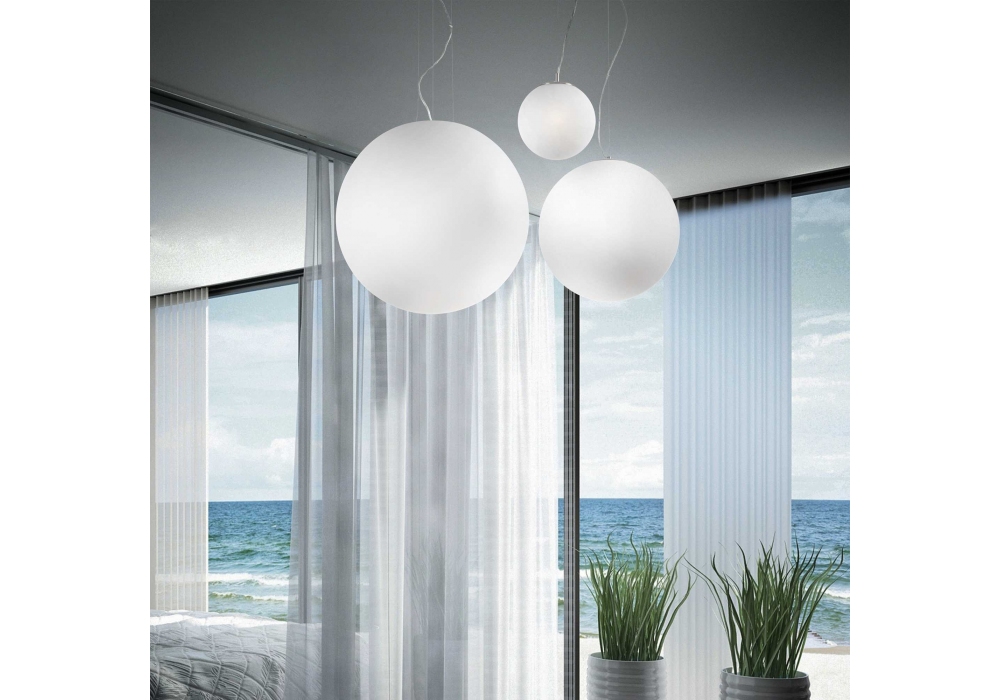 Mapa diseñada y producida por Ideal Lux es una lámpara de suspensión con estructura portante en metal pintado de blanco y cables de suspensión de acero. El difusor es esférico de vidrio soplado blanco grabado y protege una fuente de luz LED. Mapa está disponible en diferentes modelos.