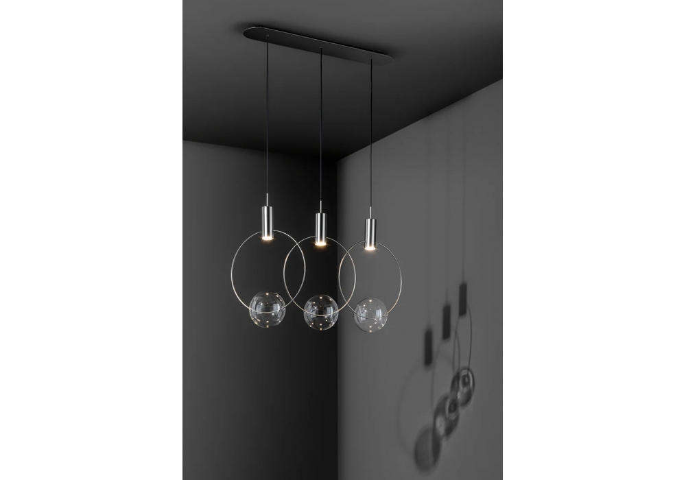 Keshi diseñada por Bonaldo Lab para Bonaldo es una lámpara de suspensión con pantalla de cristal transparente, estructura de metal en acabados níquel o bronce-cobre y rosetón en el mismo acabado de la estructura. También disponible en diferentes versiones.