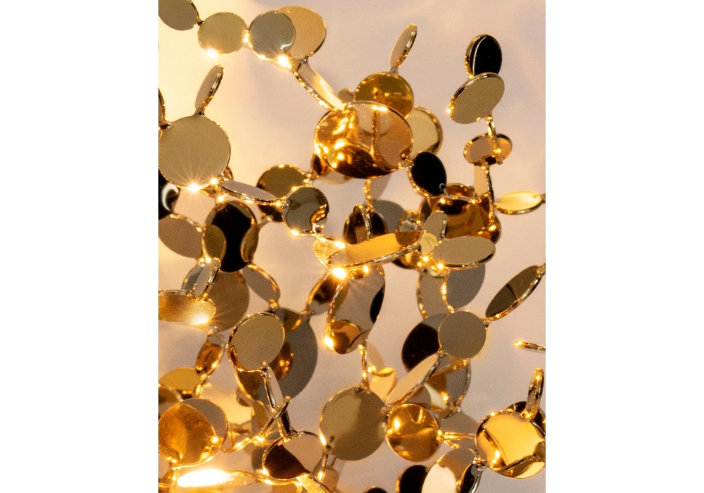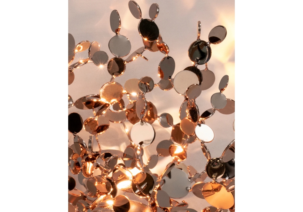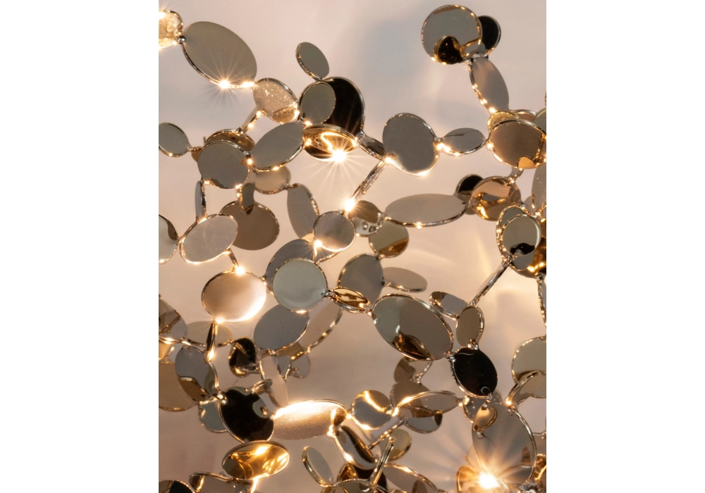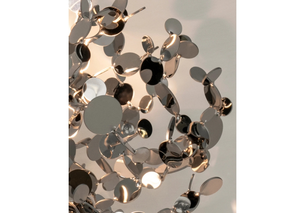 Argent Mon Bijou diseñada por Dodo Arslan para Terzani es una lámpara de suspensión estructurada por múltiples aplicaciones en acero chapado en diferentes colores. La fuente de luz adoptada es de tipo LED con sistema de atenuación disponible en diferentes versiones.