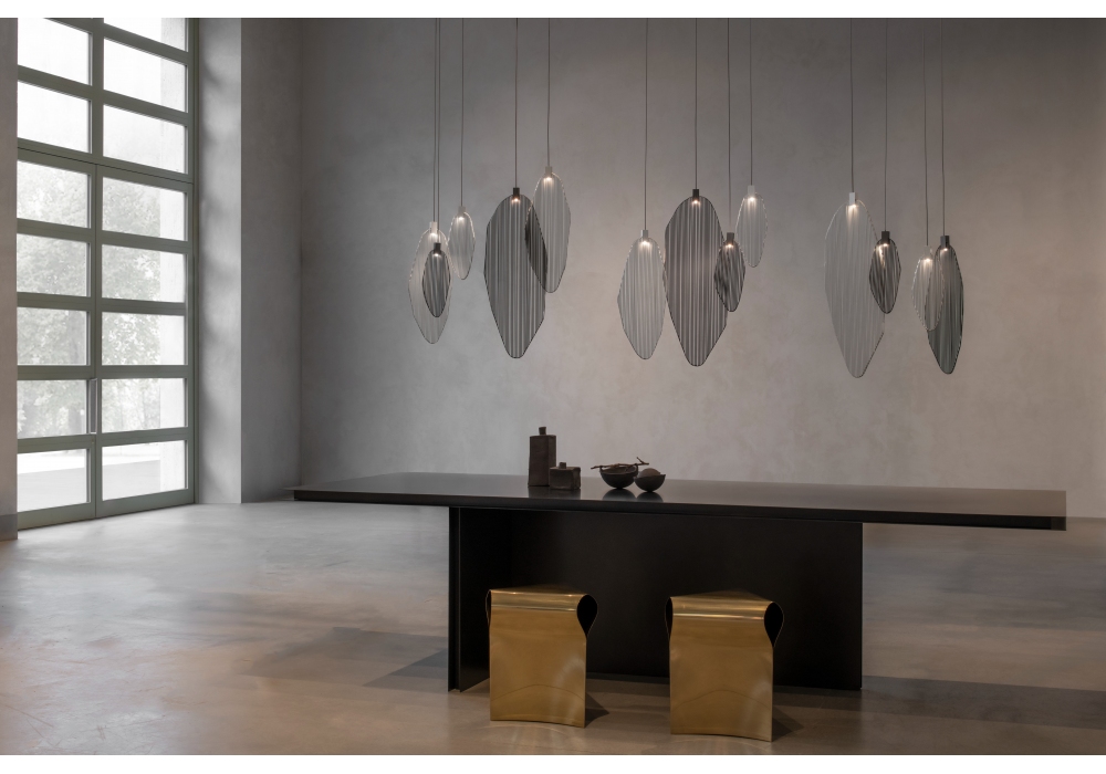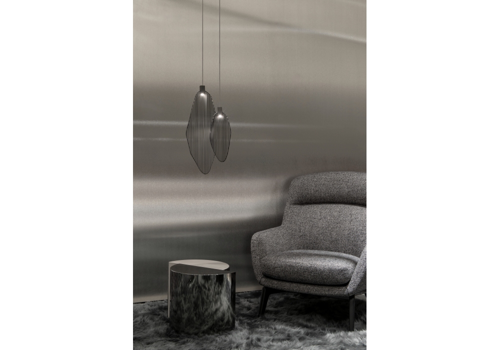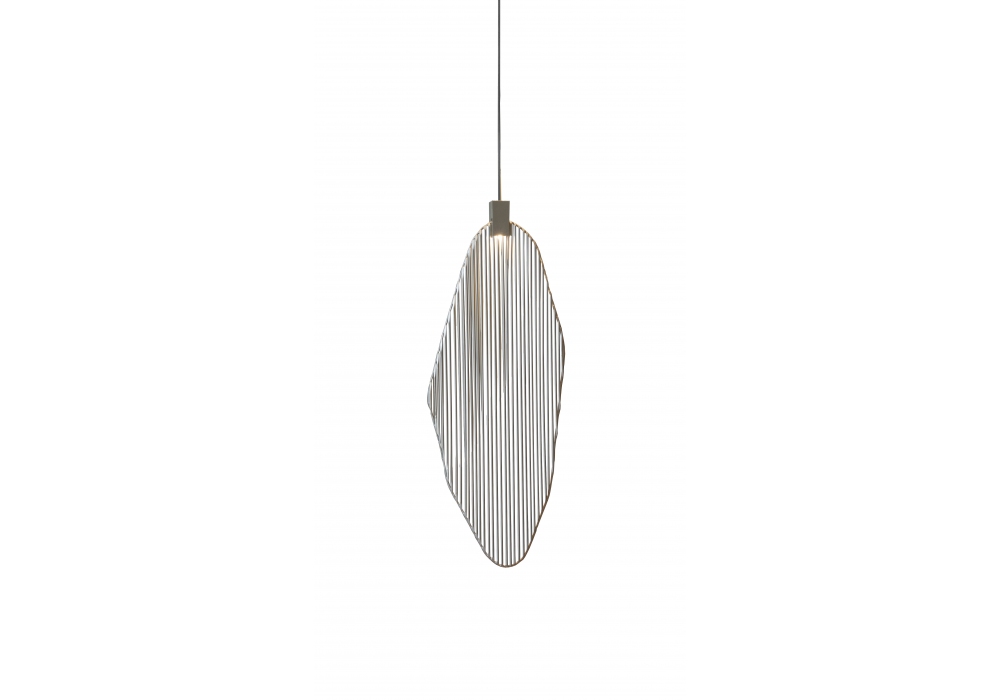 Harpe diseñada por Christian Lava para Terzani es una lámpara de suspensión estructurada íntegramente en varillas de metal con forma similar a una hoja. La fuente de luz se ubica en la parte superior de la estructura y es LED con sistema regulable. Harpe está disponible en diferentes acabados, modelos y regulables.