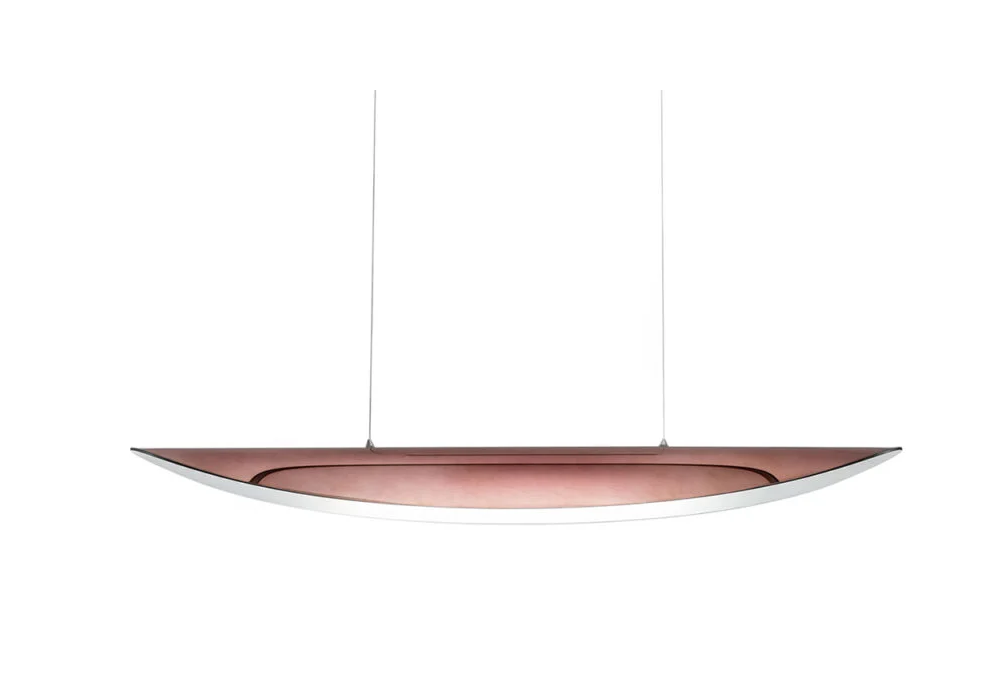 Ala diseñada por Tulczinsky para Reflex Angelo es una lámpara de suspensión de acero curvado con interior pintado en color leche. Soporte de techo en color negro mate. Exterior en acero supermirror, acabado en bronce o cobre pulverizado o en acabado oro de 24K.