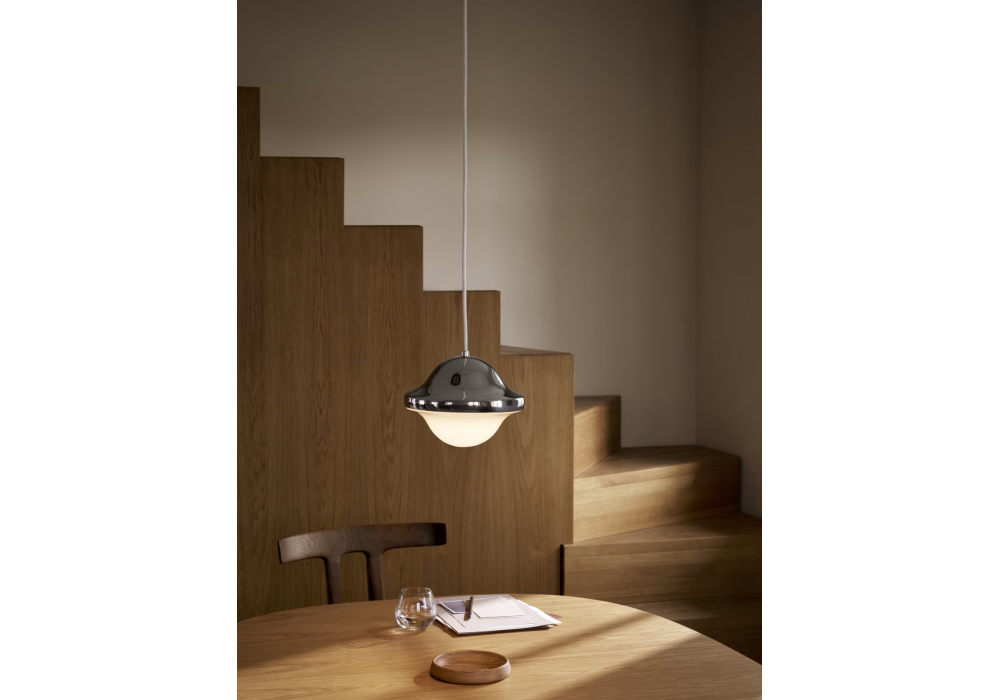 HK20 Bubi Pendant diseñada por Henning Koppel para Carl Hansen & Søn es una lámpara de suspensión con pantalla de acrílico opalino y difusor de acero cromado o bañado en latón.