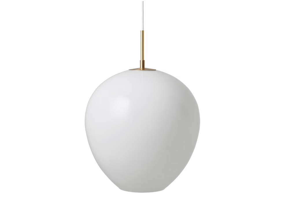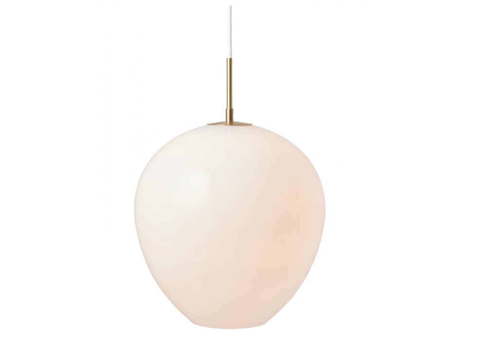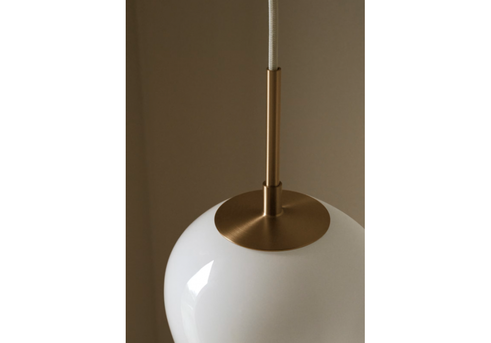 MT221Tulip Pendant diseñada por Marianne Tuxen para Carl Hansen & Søn, con pantalla de cristal opalino pulido y una pieza metálica de latón cepillado.