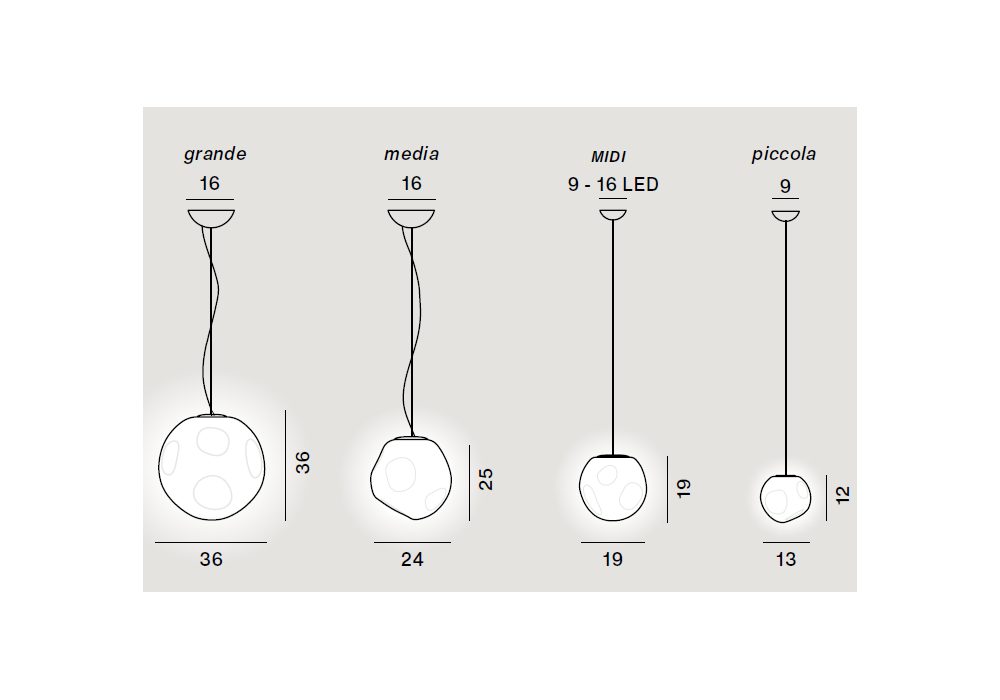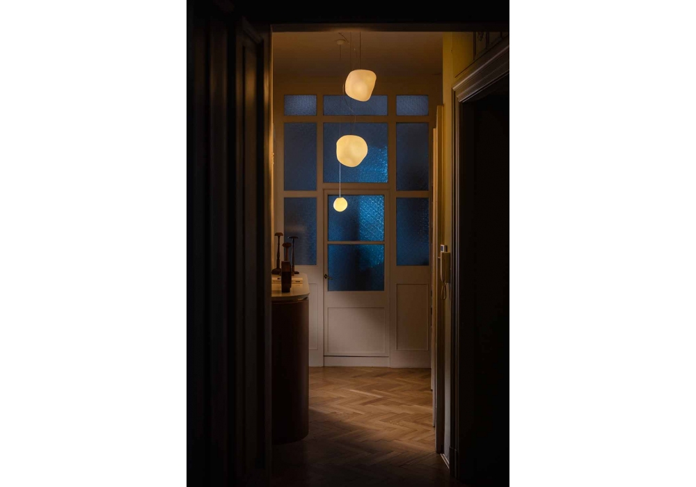 Hoba diseñada por Ludovica y Roberto Palomba para Foscarini es una lámpara de suspensión inspirada en la forma de un meteorito, asimétrica en vidrio soplado opaco. Disponible en diferentes dimensiones.