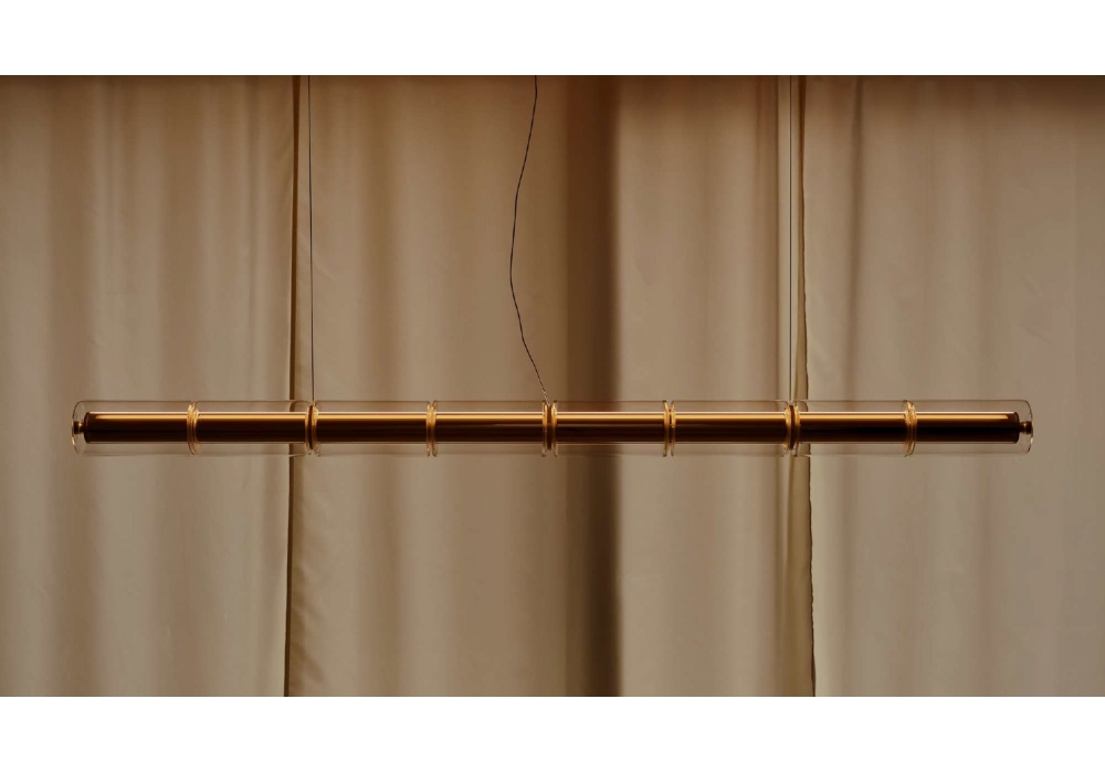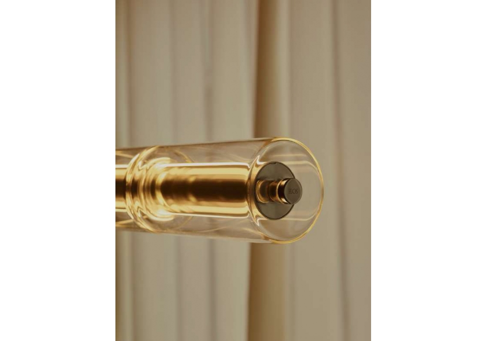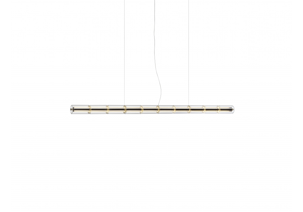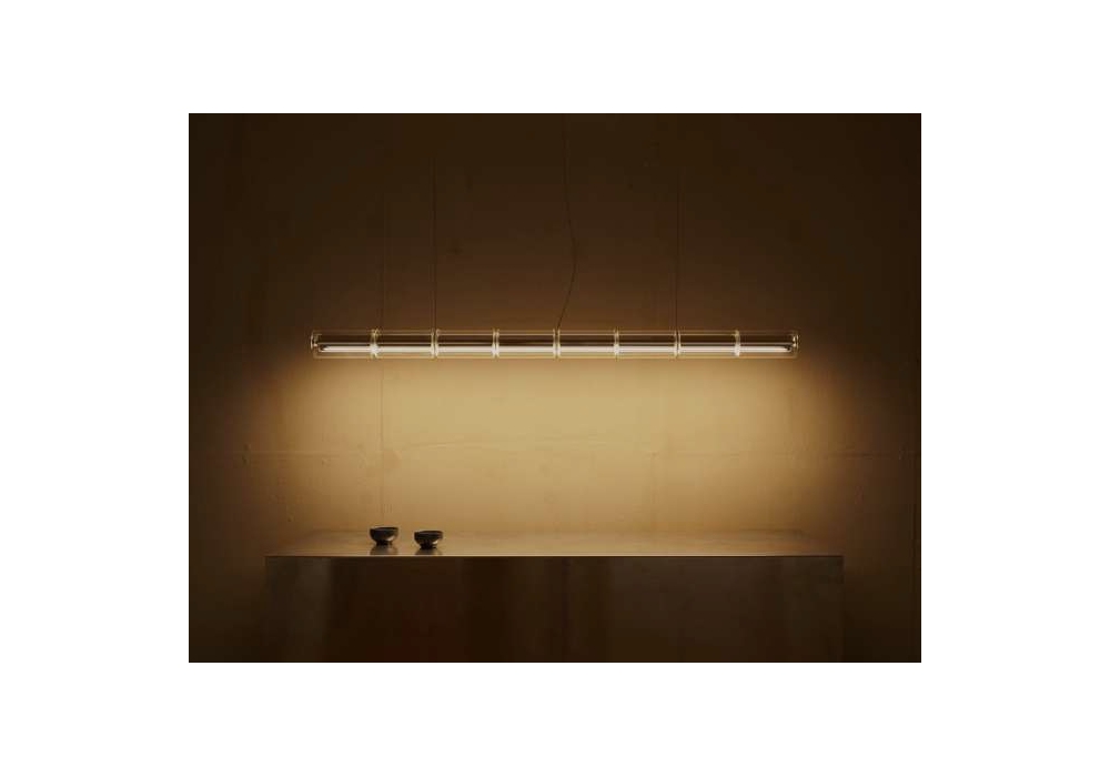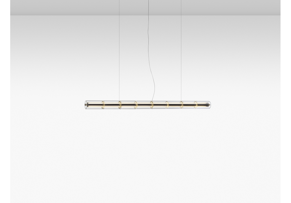 Luce Cilindrica diseñada por Ronan Bouroullec para Flos es una lámpara de suspensión con estructura de aluminio extruido pulido y módulos esféricos de vidrio borosilicato transparente. Fuente de alimentación integrada en el rosetón. Botón de control táctil, situado en un extremo del producto, para controlar el dispositivo en tres modos diferentes.