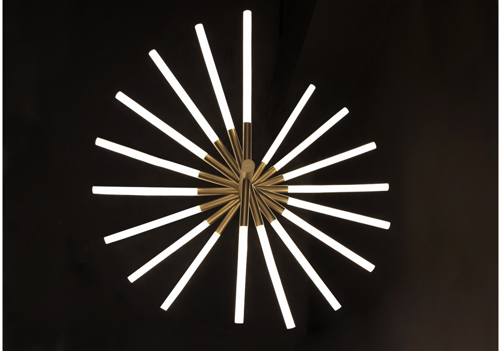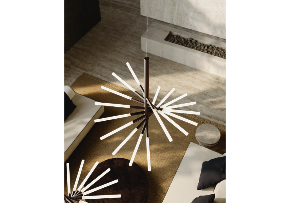 Bianca Twist diseñada por Dainelli Studio para Contardi es una lámpara de suspensión con brazos luminosos en acabado dorado o bronce. Su estructura modular se compone de elementos conectados por contacto, sin cables, que transmiten la electricidad a través de circuitos integrados. La versión Twist presenta una configuración helicoidal que realza la ligereza y el movimiento. Equipada con fuentes LED de luz cálida personalizadas (2700 K), es regulable y compatible con diversos sistemas de control.