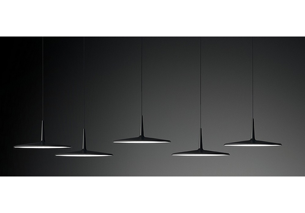 Skan 5 diseñada por Lievore, Altherr, Molina para Vibia es una lámpara de suspensión circular con placa soporte en acero y cuerpo en aluminio pintado. El difusor es de metacrilato y apantalla una fuente de luz tipo LED. Skan 5 está disponible en diferentes acabados.