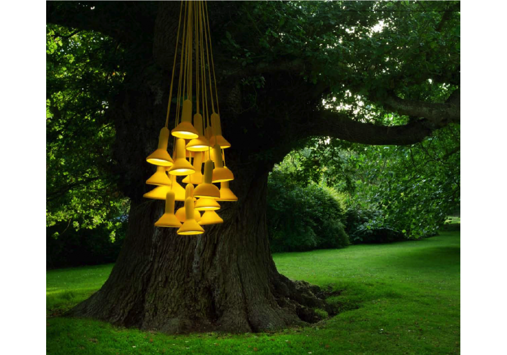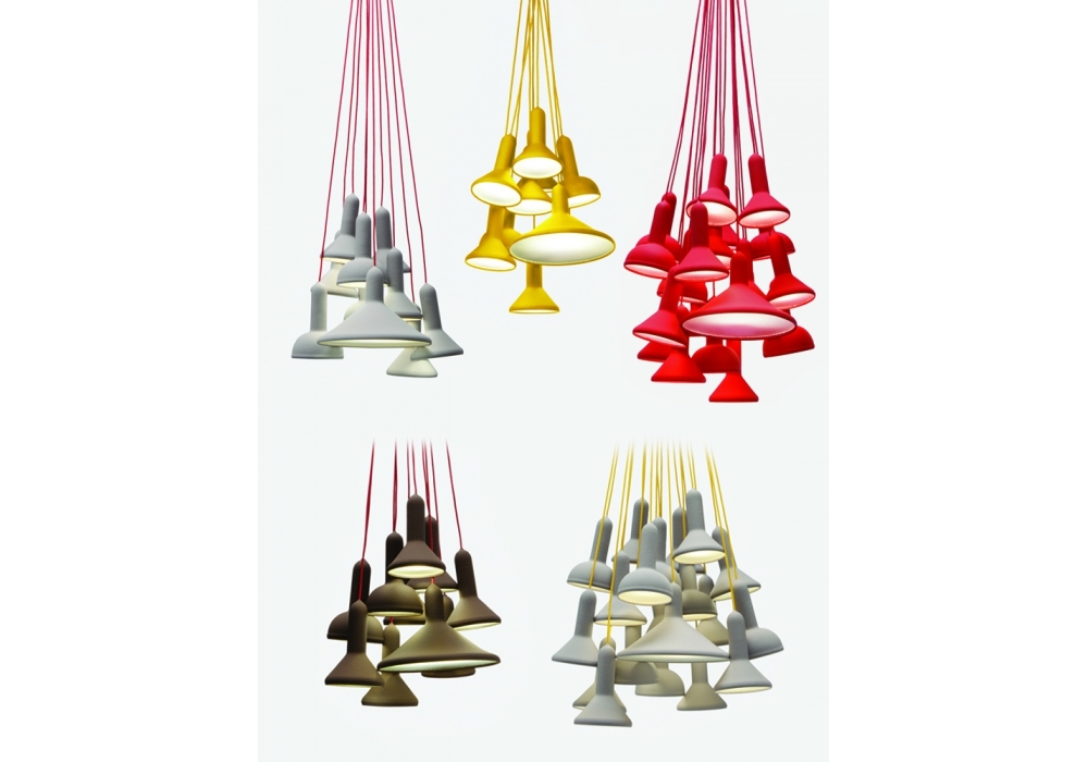 Torch Light Bunch diseñada por Sylvain Willenz para Established & Sons es una lámpara de suspensión compuesta por lámparas divididas en grupos dispuestos en 5, 10 y 20 luces. La estructura es de PVC y la pantalla con difusor de tejido romboidal. Disponible con cable en diferentes acabados.
