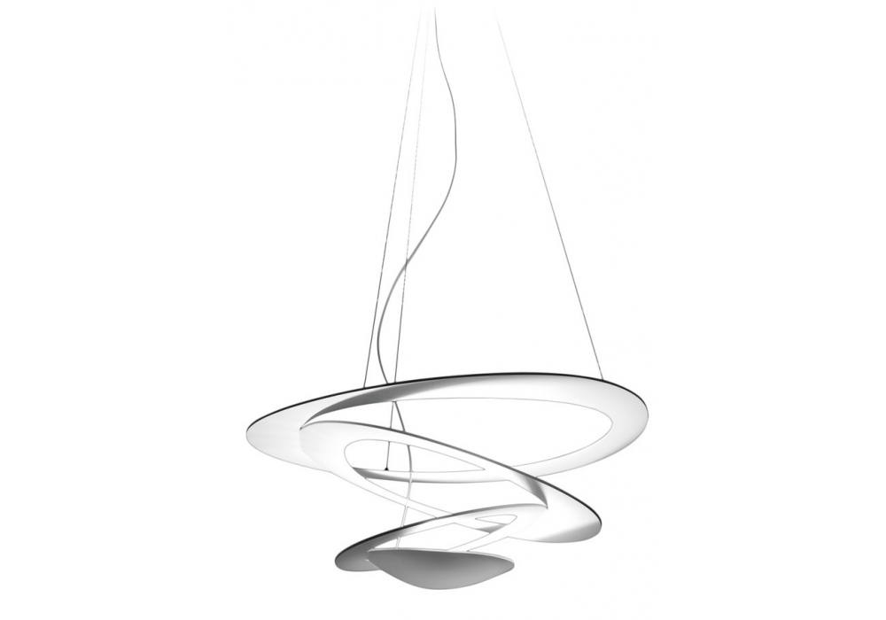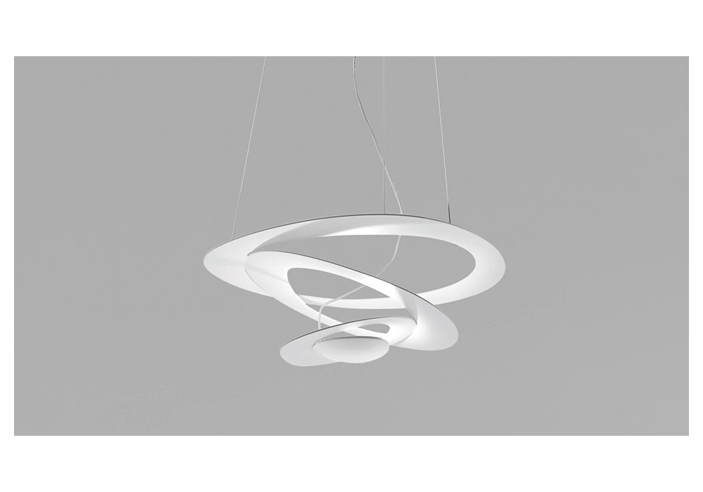 Pirce Mini diseñada por Giuseppe Maurizio Scutellà para Artemide es una lámpara de suspensión estructurada por anillos concéntricos escalonados en aluminio pintado. La fuente de luz adoptada es LED con sistema de haz luminoso regulable. Prince Mini está disponible en diferentes tonalidades de luz y acabados.