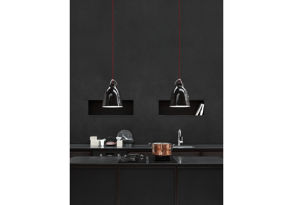 Caravaggio™ diseñada por Cecilie Manz para Fritz Hansen es una lámpara de suspensión realizada con difusor de aluminio pulido y cable textil. Cable rojo para el acabado negro, cable gris para el acabado blanco. Disponible en diferentes dimensiones.