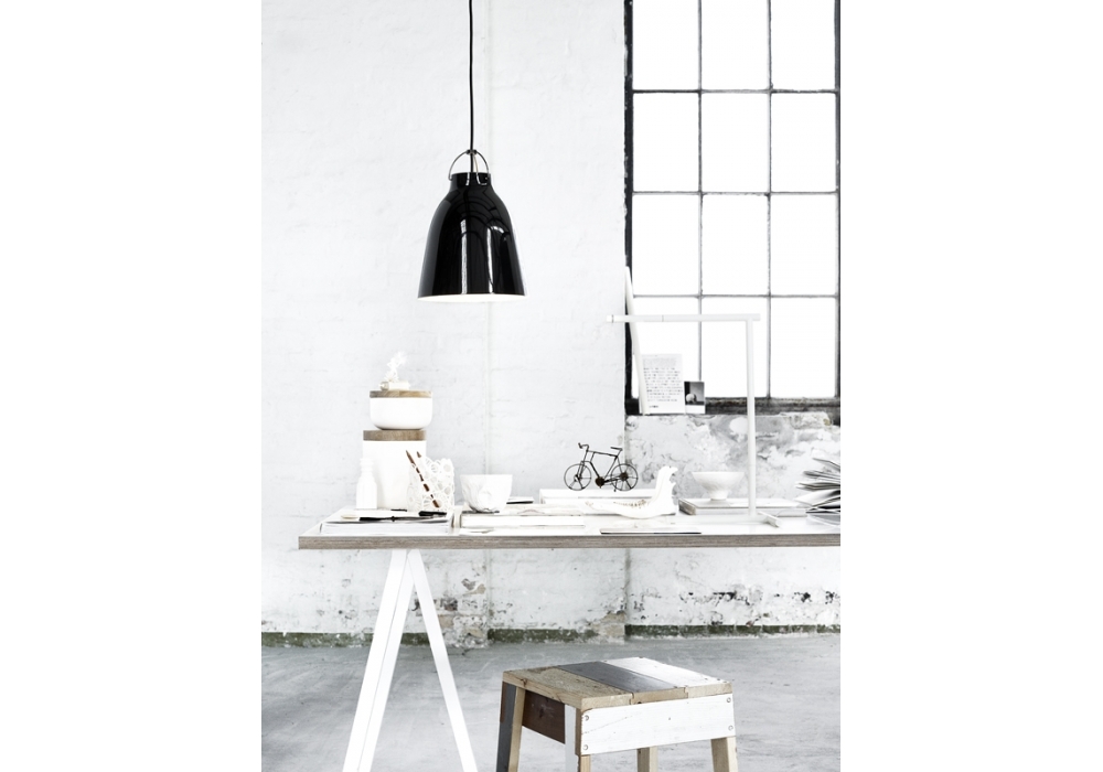 Caravaggio™ diseñada por Cecilie Manz para Fritz Hansen es una lámpara de suspensión realizada con difusor de aluminio negro brillante y cable textil negro. Disponible en diferentes dimensiones.