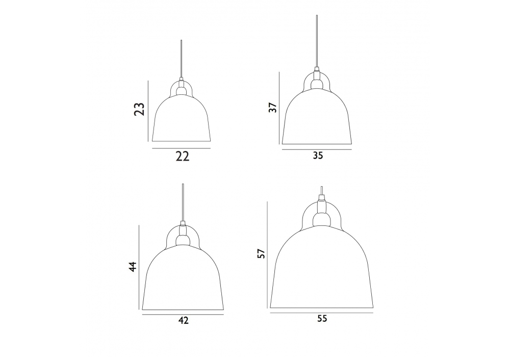 Bell, diseñada por Andreas Lund & Jacob Rudbeck para Normann Copenhagen es una lámpara de suspensión, con forma de campana, construida íntegramente en aluminio. La fuente de luz adoptada puede ser halógena o LED (no incluida), alimentada por un cable revestido de fibra textil del mismo color que la lámpara excepto en la versión color arena y la versión gris. Bell está disponible en diferentes acabados y tamaños, y en versión EU (Europa) o US (U.S.A).