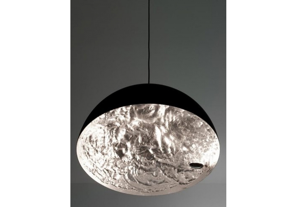Stchu-Moon 02 diseñada y producida por Catellani & Smith es una lámpara de suspensión con base de metal negro y portalámparas cuchara de acero. La forma es una semiesfera de aluminio, disponible en diferentes tamaños, con una superficie interna irregular recubierta de hoja en diferentes acabados. La semiesfera de Ø100 cm de diámetro es de fibra de vidrio.