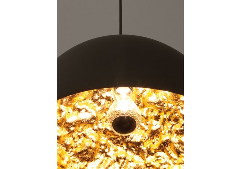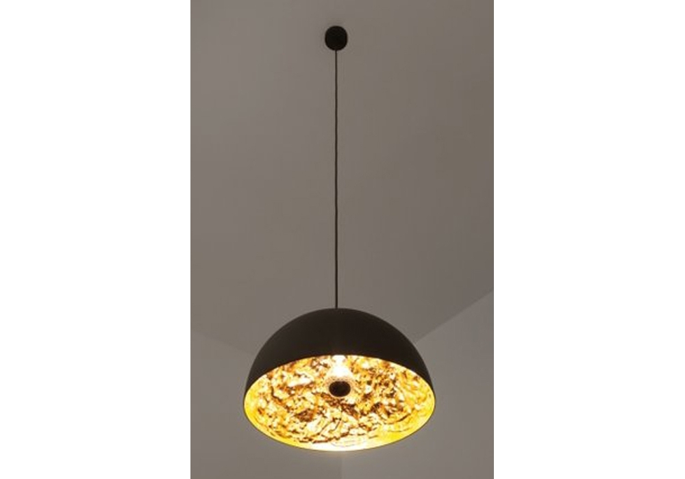 Stchu-Moon 02 230V diseñada y producida por Catellani & Smith es una lámpara de suspensión con LED, con base de níquel y cable de suspensión negro. La lámpara tiene forma de semiesfera de aluminio, con una superficie interior irregular recubierta de hoja en diferentes acabados. El exterior es negro mate. Disponible en diferentes tamaños.