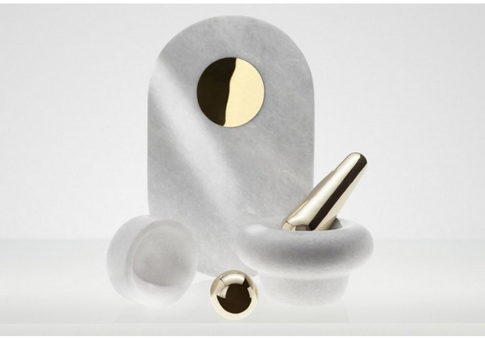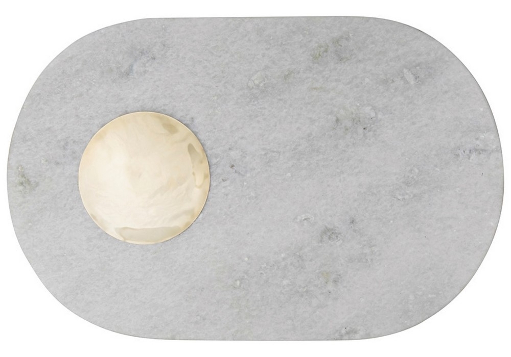 Stone diseñada por Tom Dixon es una tabla de cortar de mármol con platillo de latón extraíble apta para recoger migas.