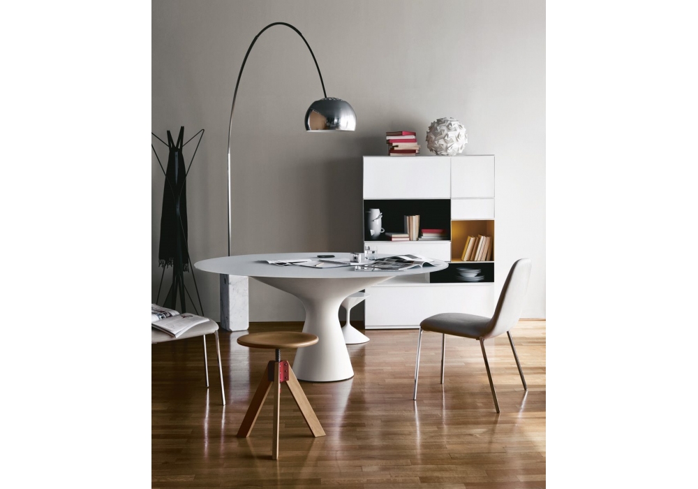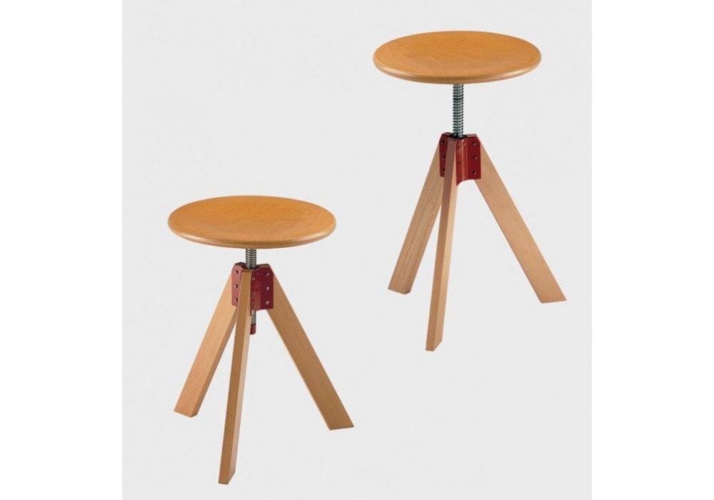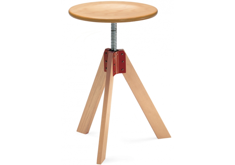 250 Giotto diseñado por De Pas, D’Urbino, Lomazzi para Zanotta es un taburete con estructura de haya natural con cruceta en rojo. Asiento giratorio y regulable en altura.