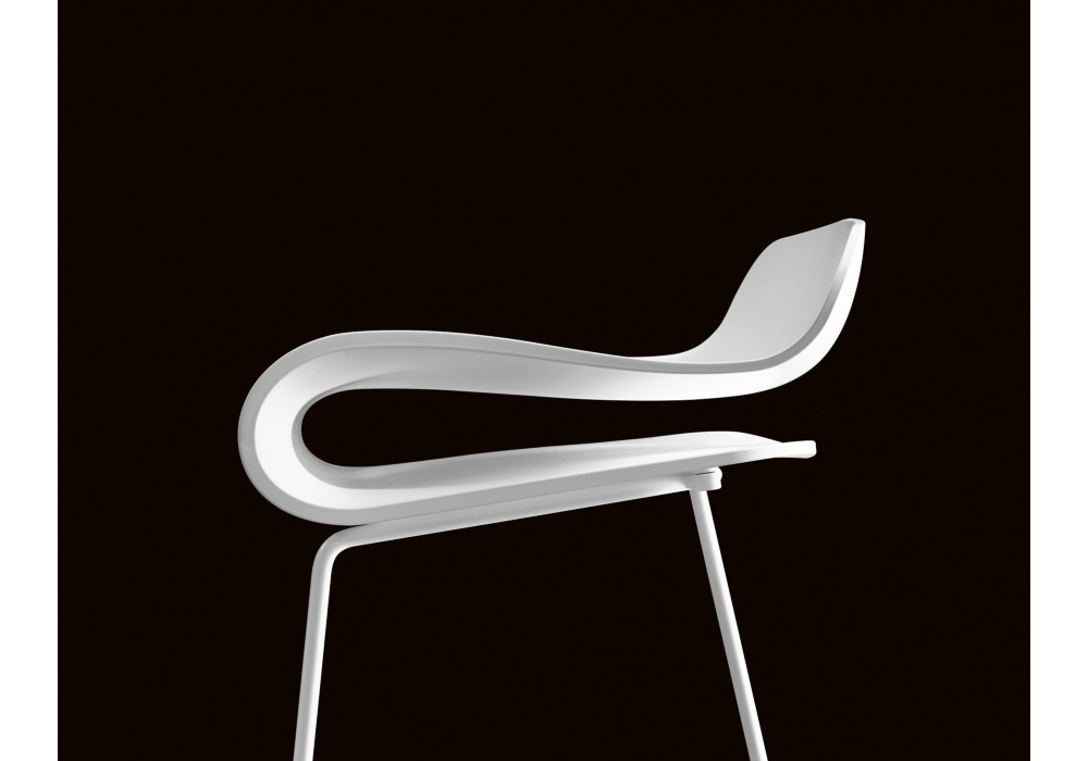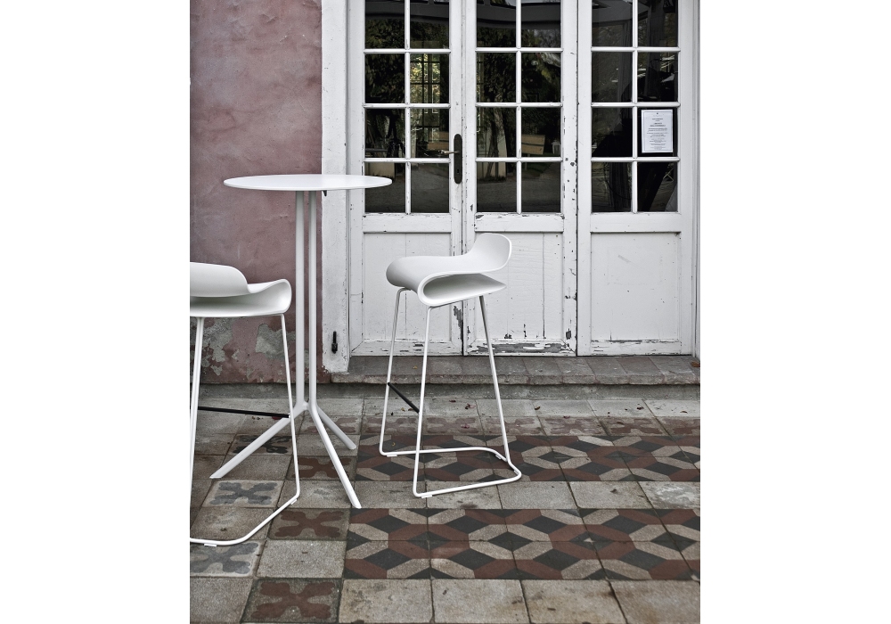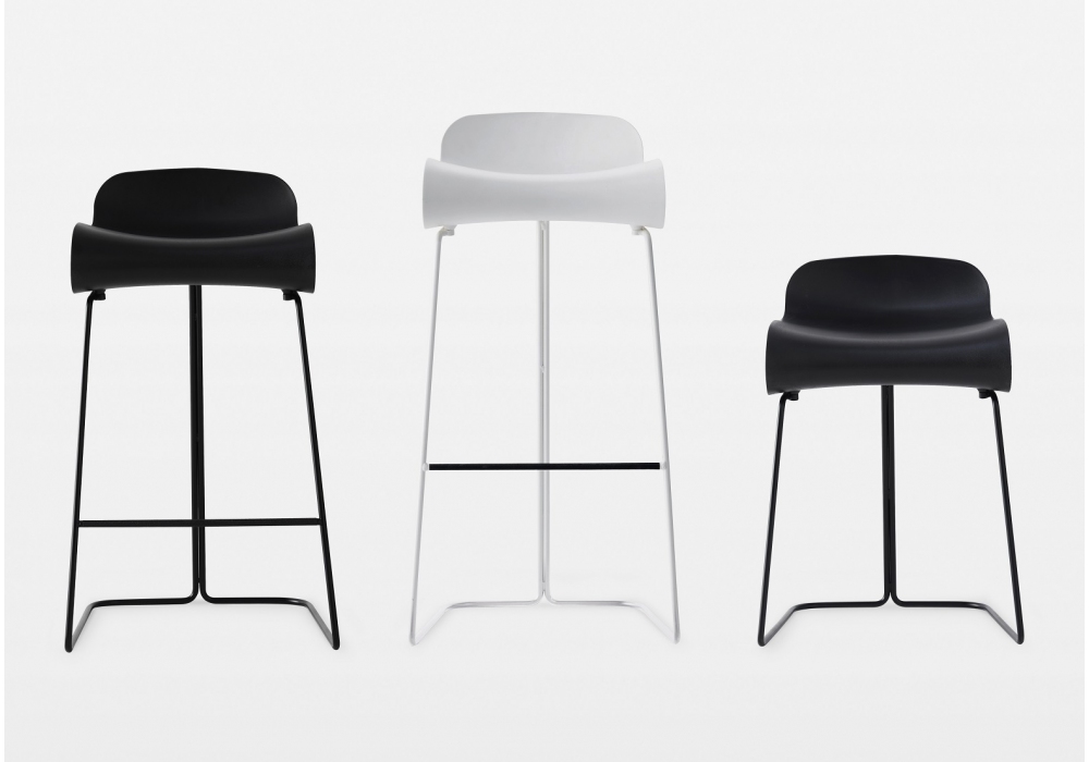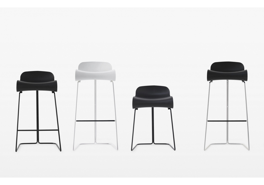 BCN diseñado por Harry&Camila para Kristalia es un taburete su trineo en acero y carcasa en PBT, un plástico resistente y flexible. Disponible en tres dimensiones.