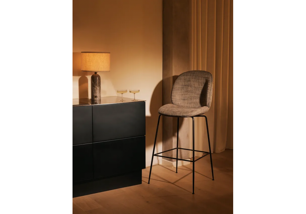 Beetle Counter diseñado por GamFratesi para Gubi es un taburete realizado con asiento y respaldo en laminado chapado impreso y base realizada con patas cónicas de acero. Revestimiento en tela o piel.