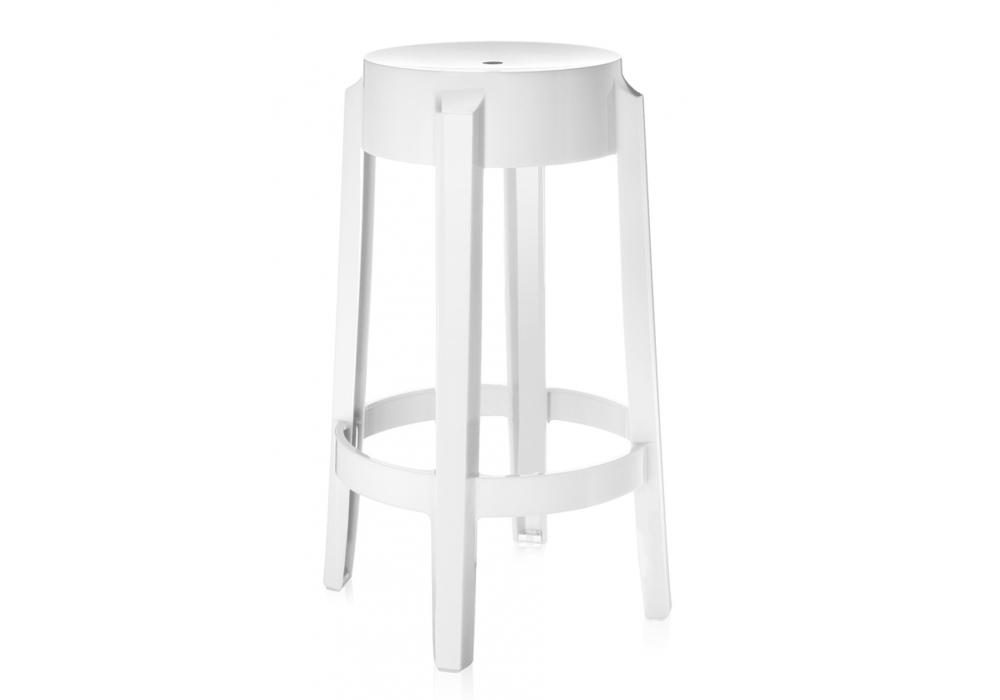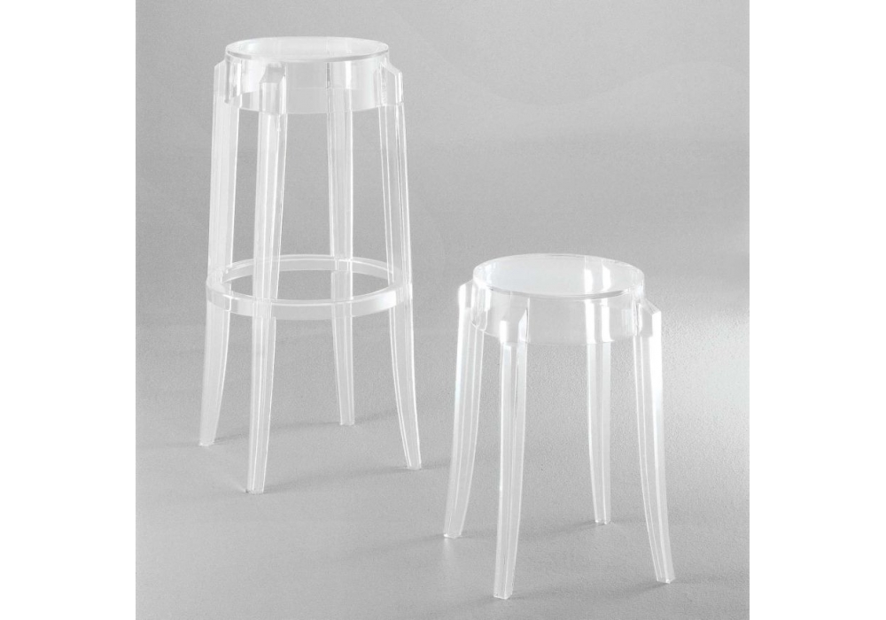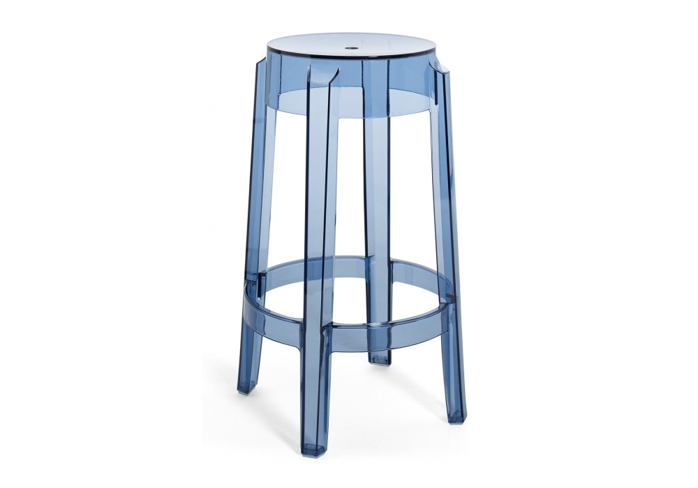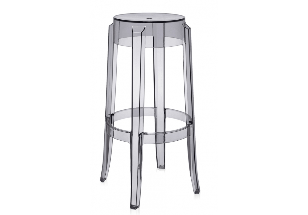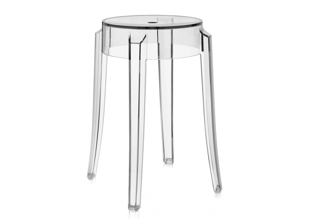Charles Ghost diseñado por Philippe Starck para Kartell es un taburete en policarbonato 2.0 transparente o teñido en masa a partir de materia prima renovable. Disponible en diferentes acabados.