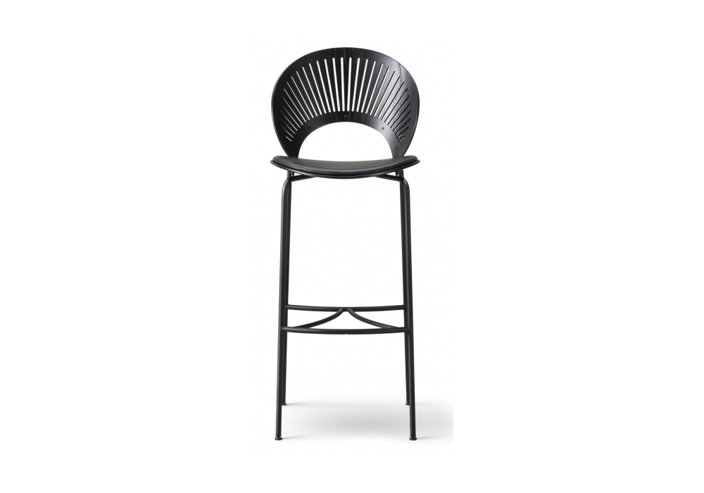 Trinidad diseñado por Nanna Ditzel para Fredericia es un taburete de bar con estructura en tubo de acero, respaldo en madera contrachapada moldeada con cortes fresados en CNC. Asiento y respaldo montados con remaches.