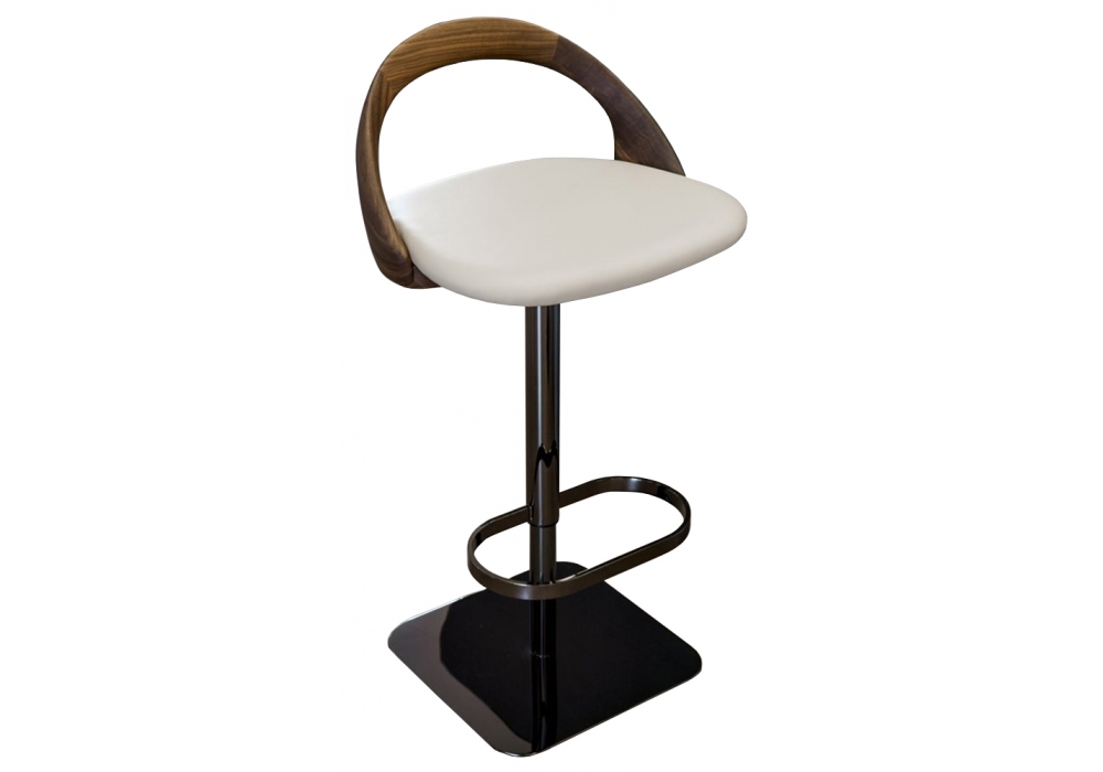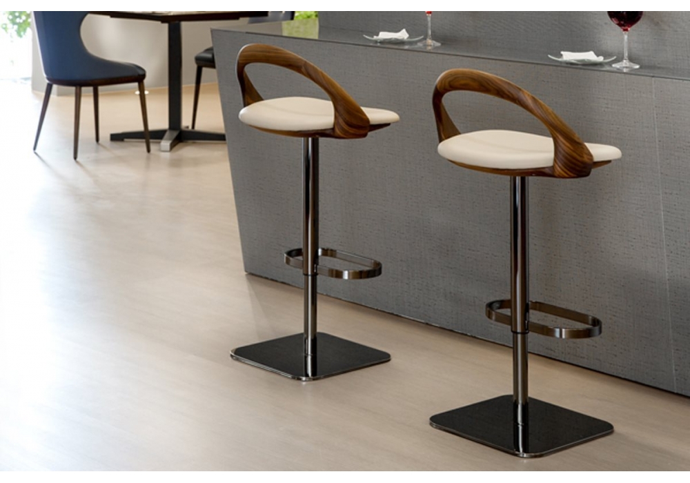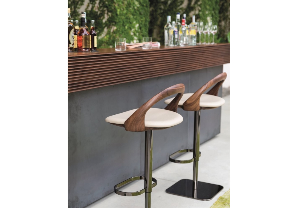 Ester diseñado por S. Bigi para Porada es un taburete con estructura en madera maciza de canaletta o fresno disponible en diferentes acabados. Revestimiento en piel o tela. Base en metal cromado negro. Disponible en dos dimensiones.