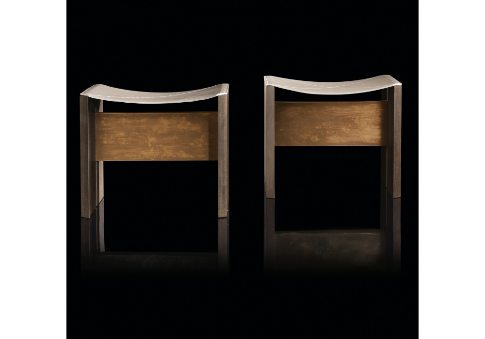 Rio Stool diseñado por Massimo Castagna para Henge es un taburete con estructura en madera, asiento tapizado en piel, barra central disponible en diferentes acabados.