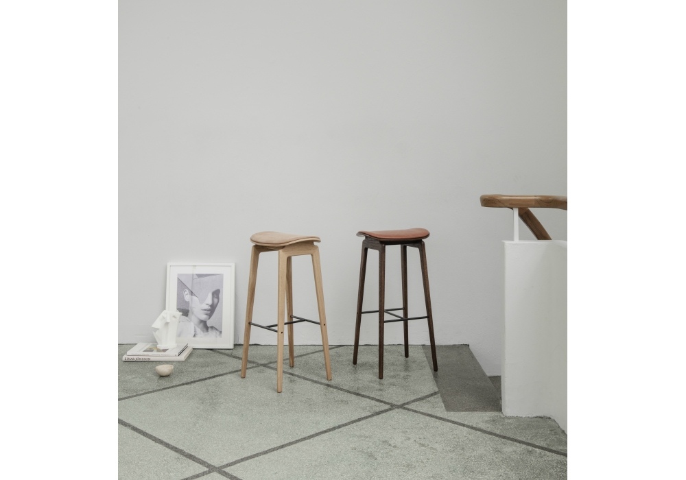 NY11 Bar Chair diseñada por Rune Krøjgaard y Knut Benedik Humlevik para Norr11 es un taburete con estructura de madera maciza de roble. Disponible en diferentes variantes de cuadro: teñido natural, oscuro y negro. El asiento puede estar cubierto de tela o cuero.
