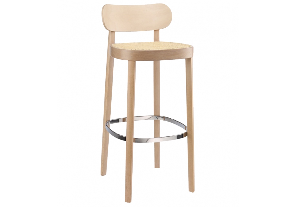 118 H / HT diseñado por Sebastian Herkner para Thonet es un taburete de bar con estructura en madera maciza de haya, en diferentes acabados. Asiento en mimbre trenzado y reposapiés cromado. También disponible en 2 alturas.