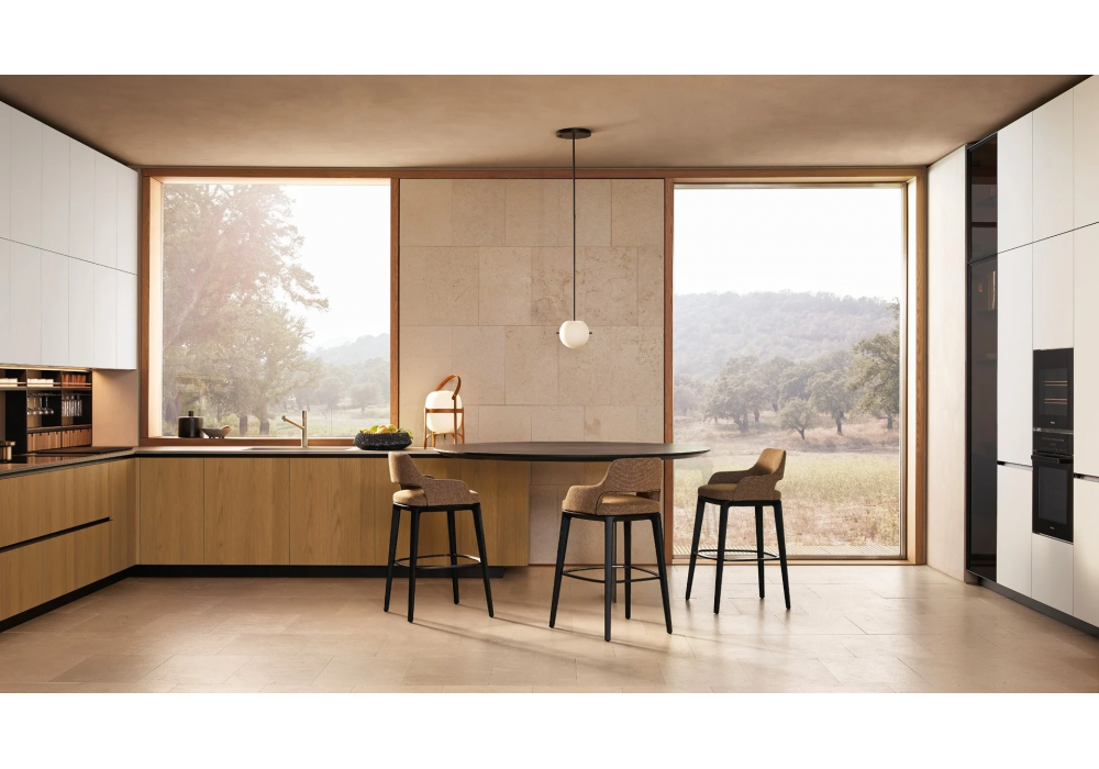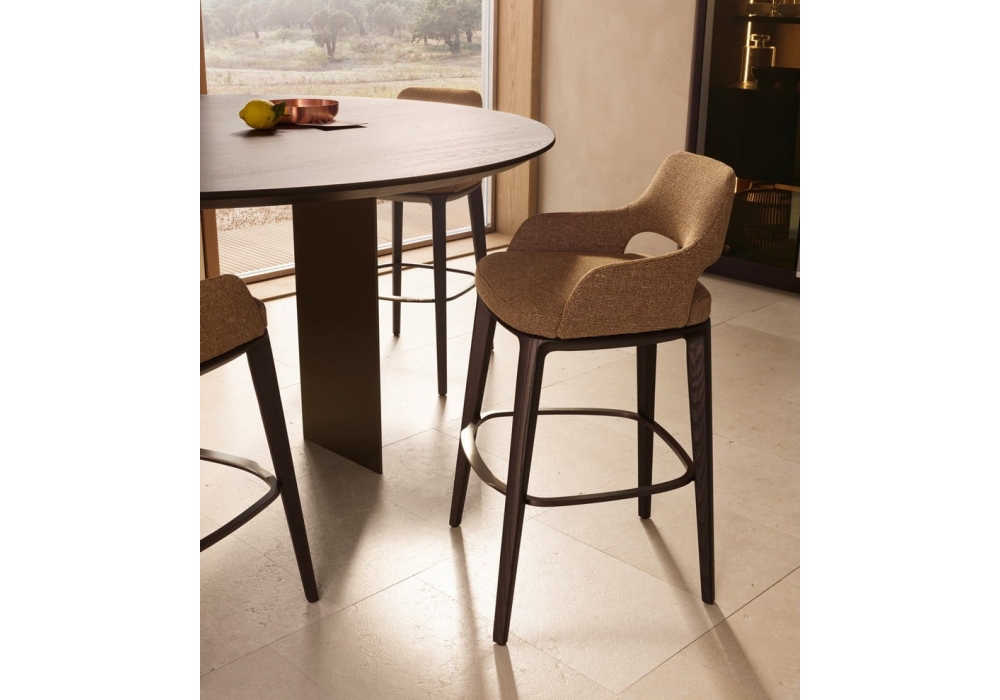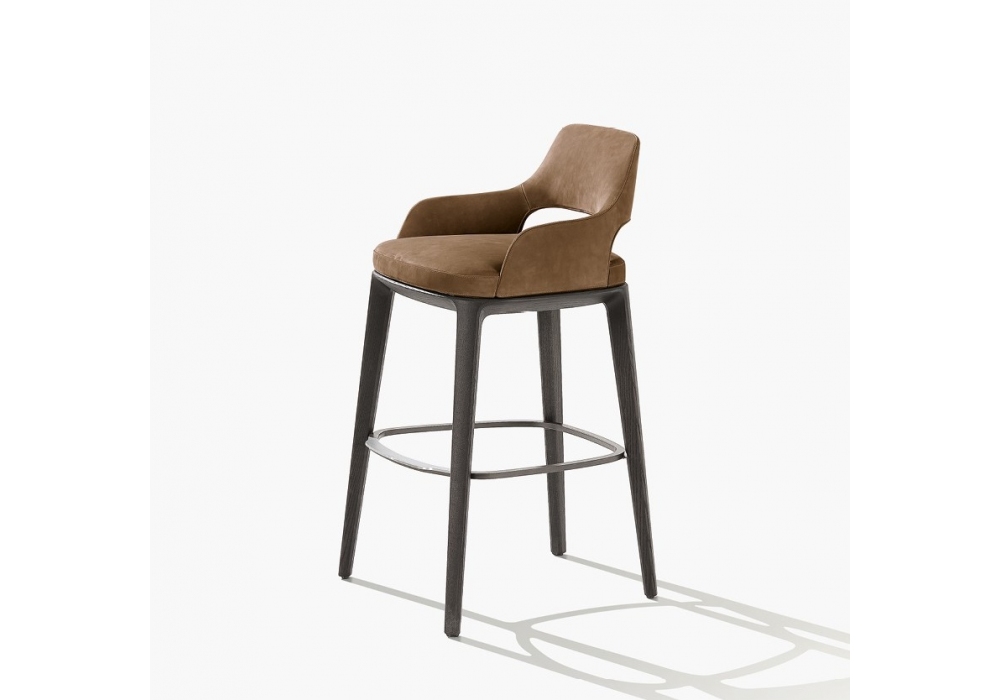 Sophie Lite diseñado por Emmanuel Gallina para Poliform es un taburete con reposapiés en níquel marrón mate. Estructura de madera en nogal, roble spessart u olmo negro. Revestimiento en piel o tela. Disponible en dos dimensiones.