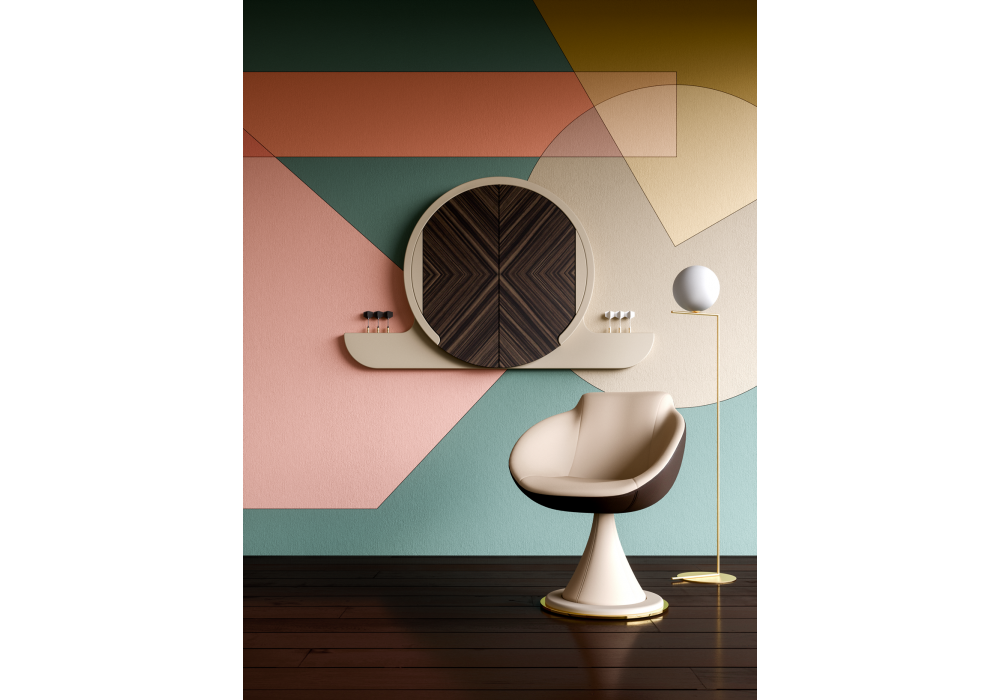 Comfort Chair diseñada por Vismara Design es una silla giratoria tapizada en la parte del asiento en econabuk y externamente en cuero plena flor, pata tapizada en piel plena flor, base en madera lacada mate y detalles metálicos. Elección de colores.