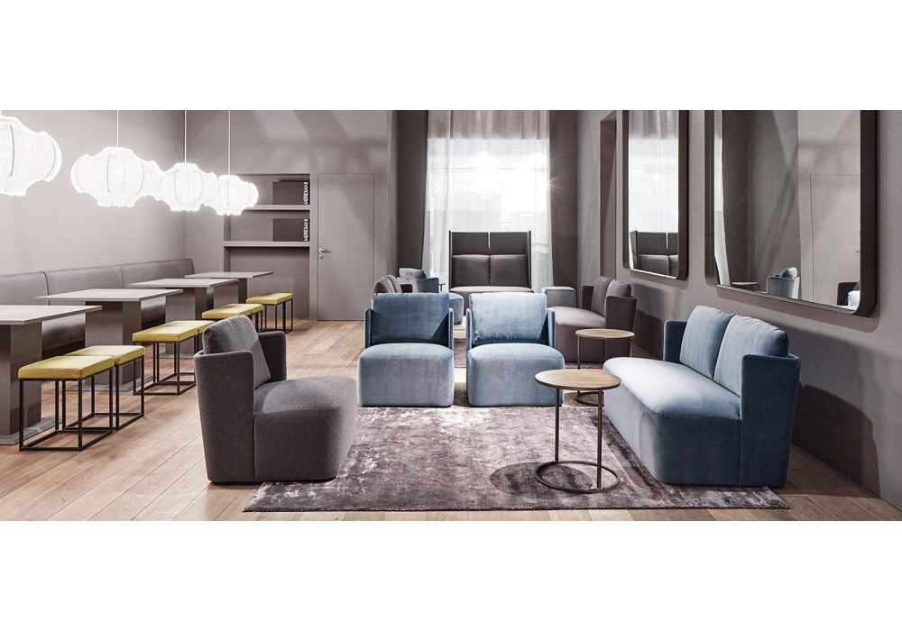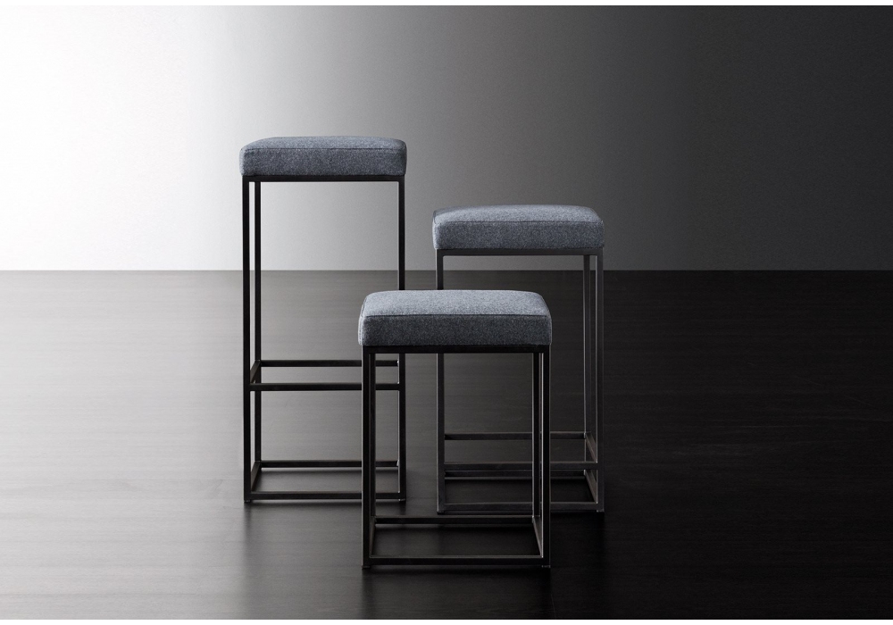 Hardy diseñado por Andrea Parisio para Meridiani es un taburete con asiento acolchado en poliuretano indeformable y estructura en metal. Revestimiento disponible en tejido o piel.