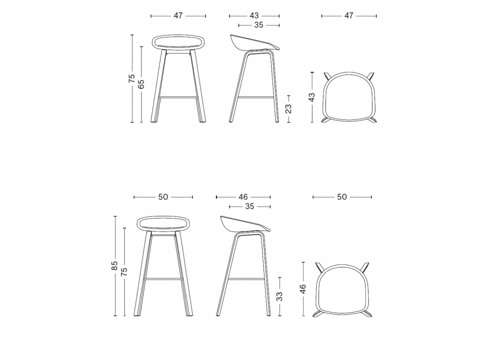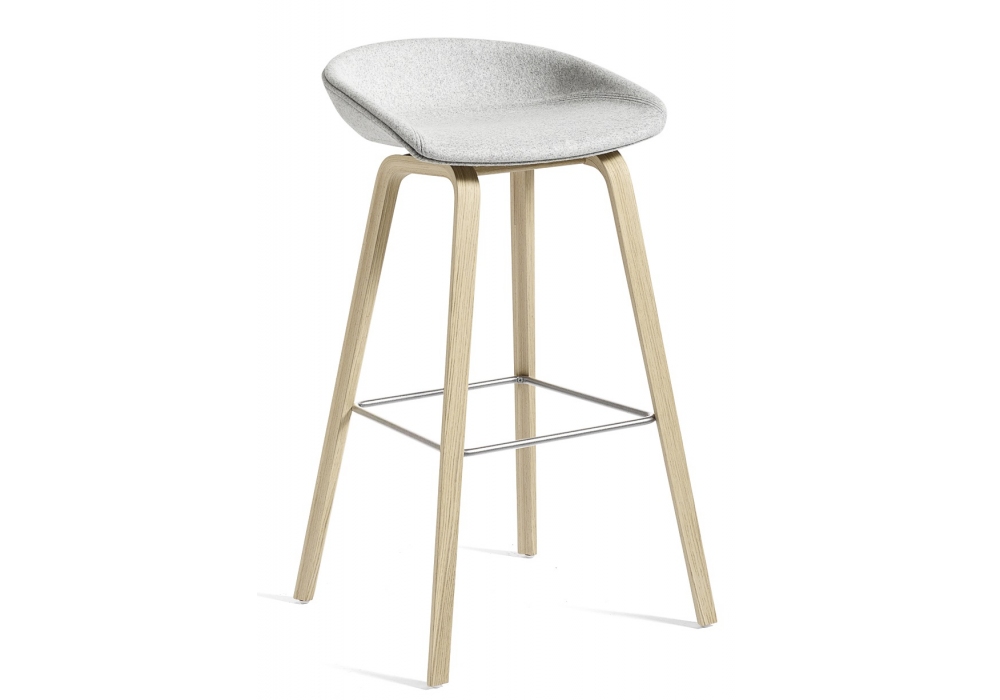 About a Stool AAS 33 diseñado por Hee Welling & Hay para Hay es un taburete con carcasa de polipropileno moldeado por inyección con completo acolchado, base en roble o nogal y reposapiés en negro o acero inoxidable. Disponible en diferentes medidas y tapizados.