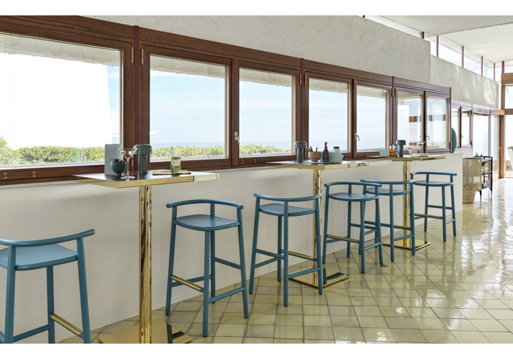 Single Curve diseñado por Nendo para Gebrüder Thonet Vienna es un taburete realizado en haya curvada, disponible en diferentes acabados. Asiento en madera contrachapada o paja de Viena. Barra reposapiés revestida en latón.