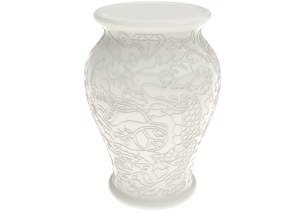 Ming Translucent diseñado por Studio Job para Qeeboo es un taburete/mesa auxiliar LED recargable realizado en polietileno. La fuente de luz adoptada es de tipo LED, manejable por control remoto. Ming Translucent se puede utilizar en interiores o exteriores.