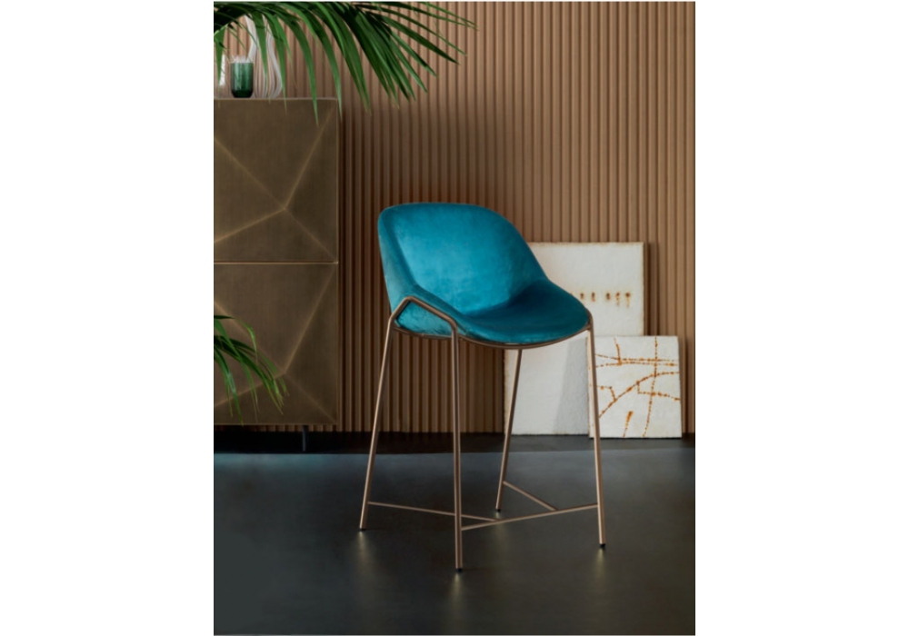 Nova diseñado por Carlesi Tonelli studio para Riflessi es un taburete con revestimiento en poliuretano flexible moldeado en frío y bisagra decorativa. Patas pintadas en aluminio y tapizado en tela o piel. Disponible en diferentes acabados.