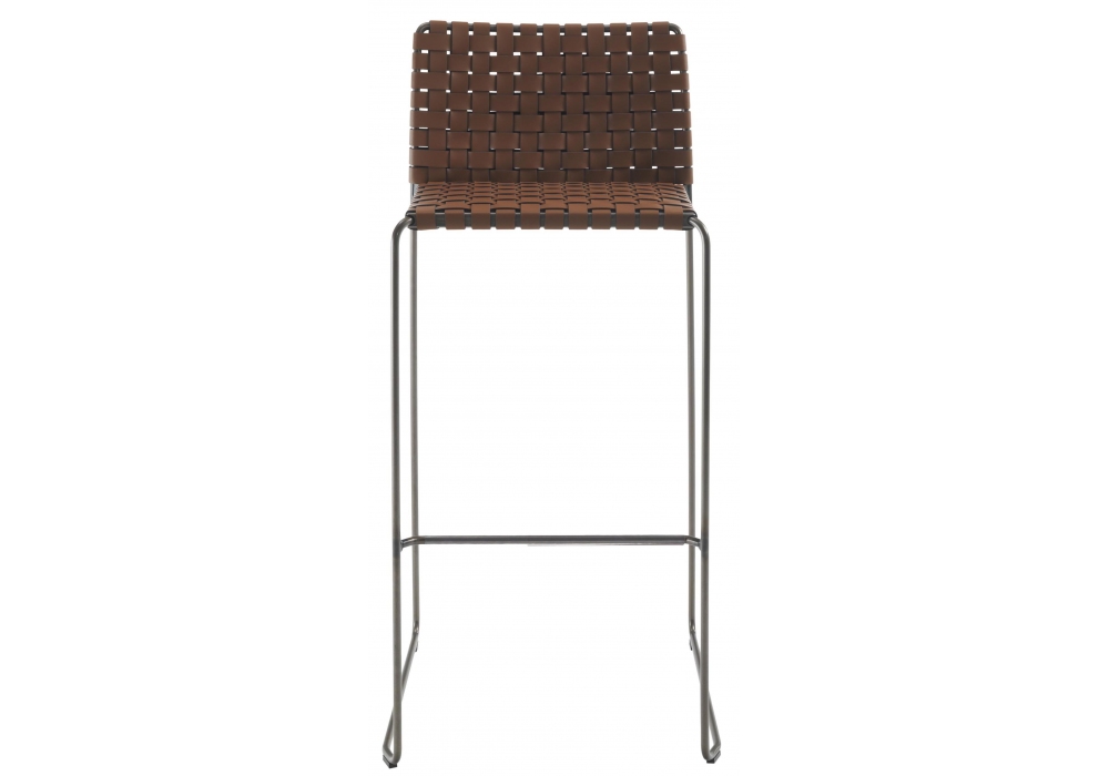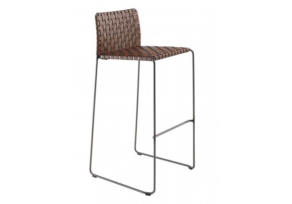 Bizzy Intrecciato diseñado por Franco Bizzozero para Enrico Pellizzoni es un taburete con estructura de varillas de acero, en diferentes acabados, asiento y respaldo tapizados en piel trenzada. Bajo del asiento de chapa revestida de tejido técnico negro. Disponible en diferentes tamaños.