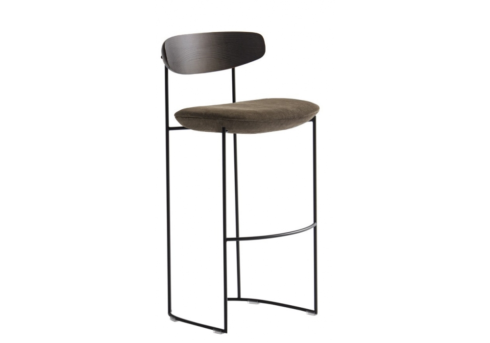 Keel diseñado por M + V para Potocco es un taburete con estructura en varilla de metal pintado gofrado, respaldo en fresno macizo y asiento tapizado en espuma de poliuretano ignífuga con tapizado en varios tejidos, pieles o ecopieles.