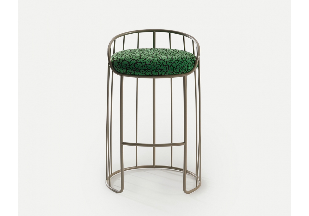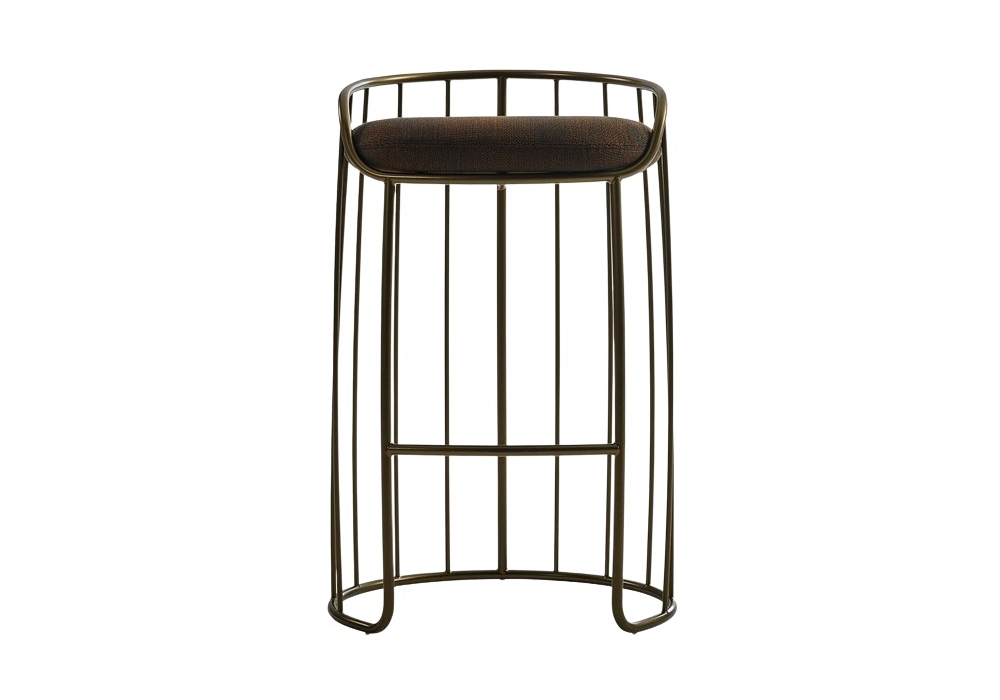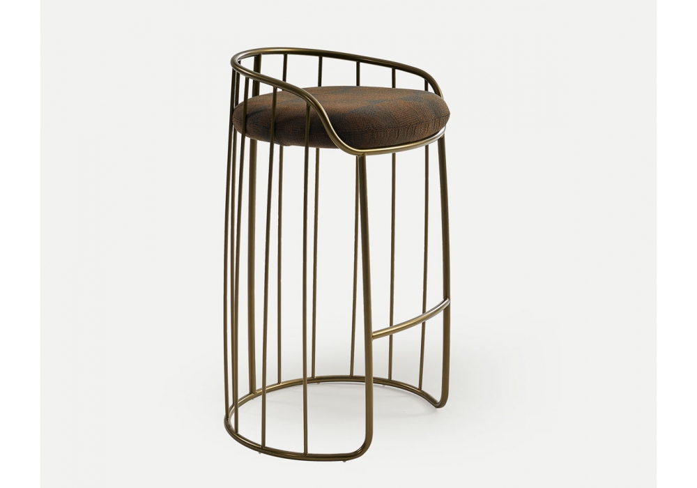 Tonella diseñado por Note Design Studio para Sancal es un taburete con estructura en bronce pulido o metal lacado extra mate en diferentes acabados, asiento acolchado revestido en tela o piel. Disponible en dos alturas.