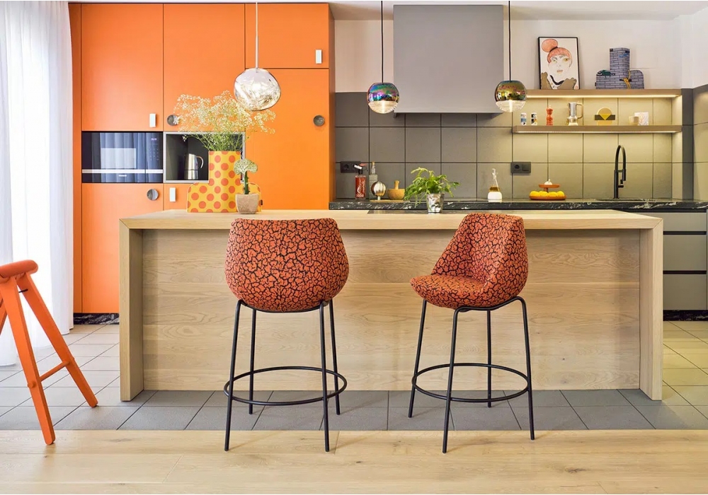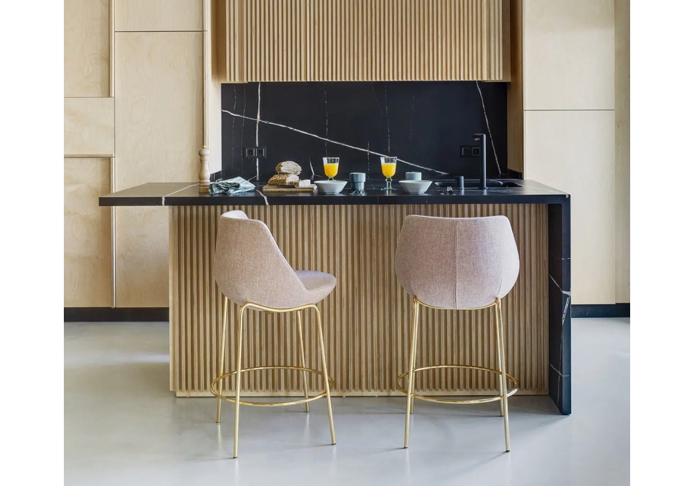 Magnum diseñado por EstudiHac para Sancal es un taburete con patas de acero acabado dorado o lacado mate en diferentes colores, asiento acolchado y respaldo tapizado en tejido.