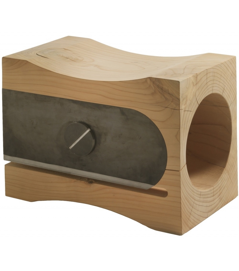 Temperino diseñado por Alessandro Guidolin para Riva 1920 es un taburete / banco en cedro perfumado macizo trabajado de un solo bloque, reproducción de una navaja "fuera de escala" con detalles de metal.
