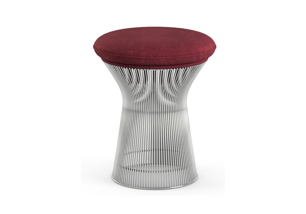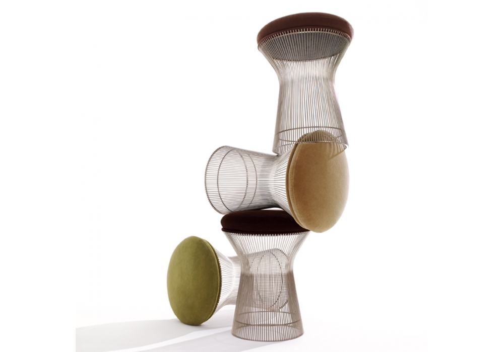 Platner diseñado por Warren Platner para Knoll es un taburete con estructura de varillas metálicas perfiladas vertical y horizontalmente, tratadas con baño de níquel y acabado protector transparente, pintadas en color bronce o en acabado oro de 18k. Base ribeteada con plástico extruido transparente para proteger el suelo. Tapizado en tela o piel.