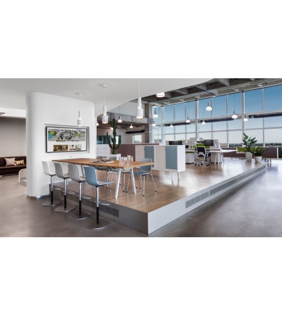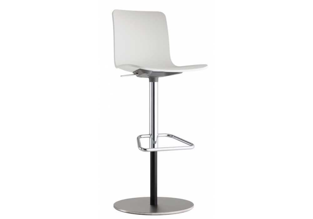 HAL RE Barstool diseñado por Jasper Morrison para Vitra es un taburete realizado con carcasa de polipropileno reciclado teñido en masa con mecanismo giratorio. Soporte de acero tubular regulable en altura, resorte de gas con recubrimiento de polvo en basic dark, cubierta de la columna y reposapiés de acero tubular con superficie antideslizante. Placa base de acero con acabado de acero inoxidable cepillado (mate); parte inferior en fieltro.