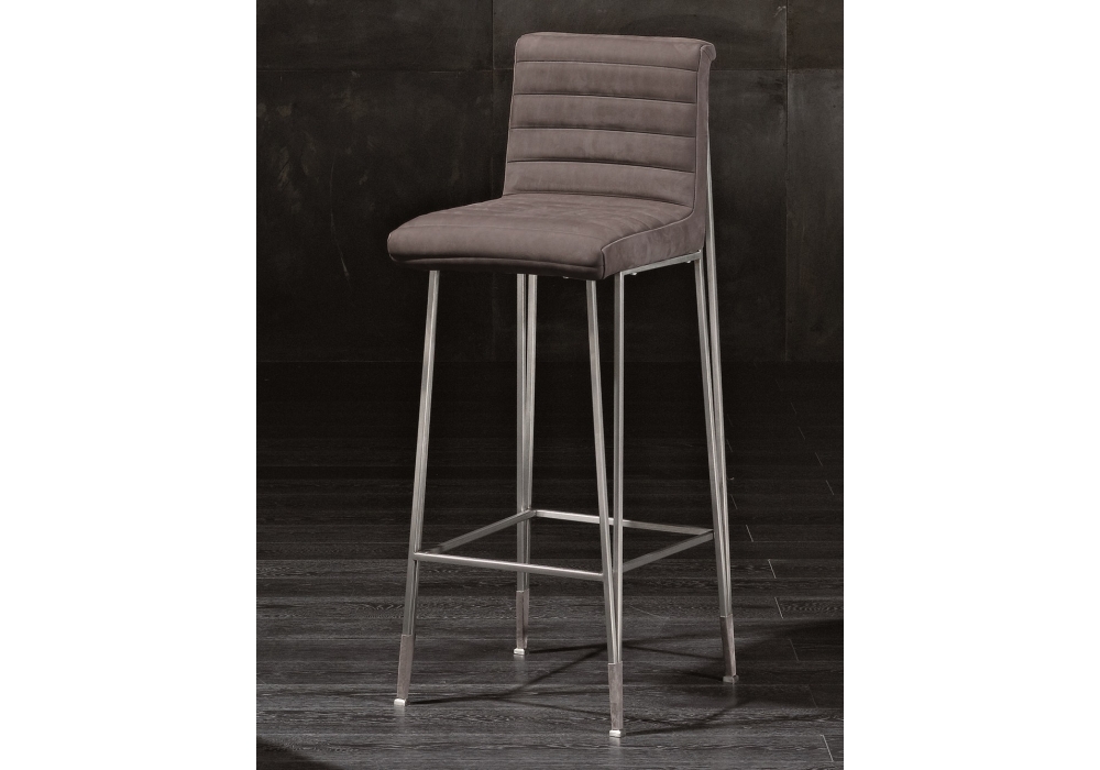 Yuki diseñado por Rugiano es un taburete con estructura de acero en acabado latón bronceado y asiento tapizado en piel en diferentes acabados.