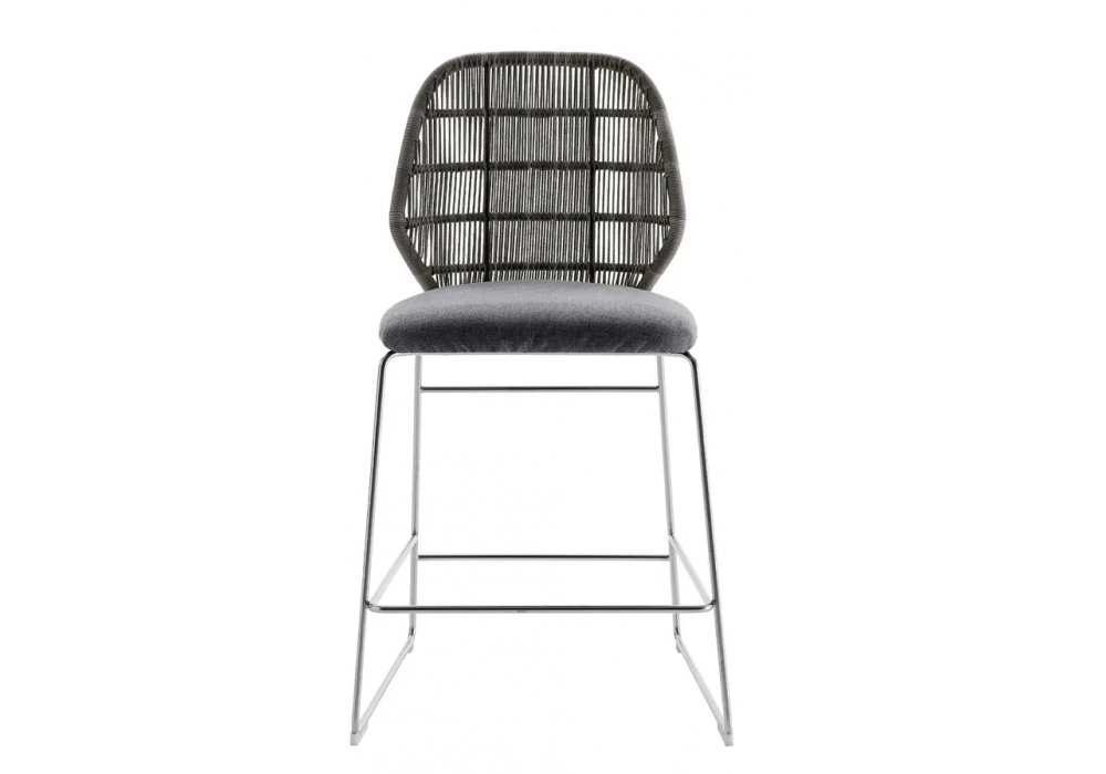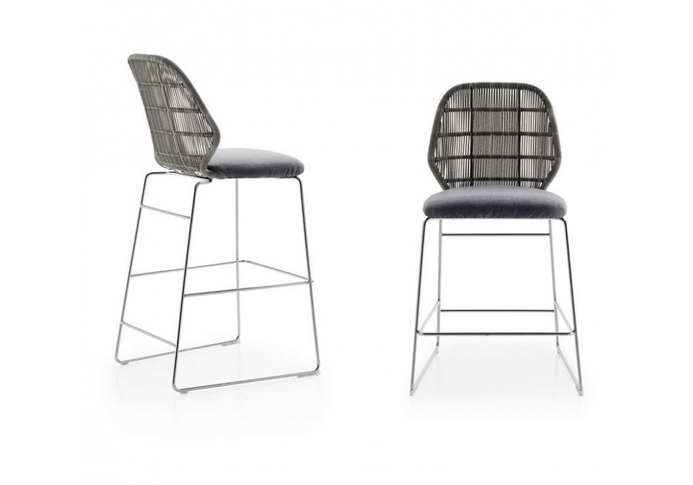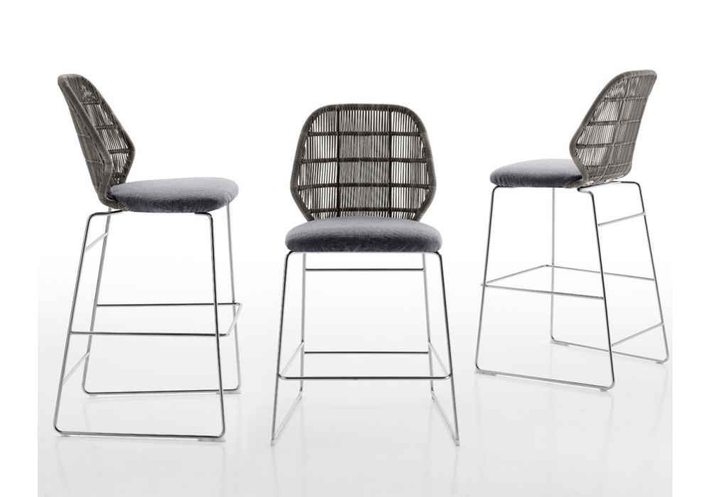 Crinoline diseñado por Patricia Urquiola para B&B Italia Outdoor es un taburete disponible en dos dimensiones. Estructura en aluminio barnizado en polvo poliéster tortora, trenzado en polietileno tortora y base en acero inoxidable. Cojín asiento y respaldo con revestimiento en tejido.