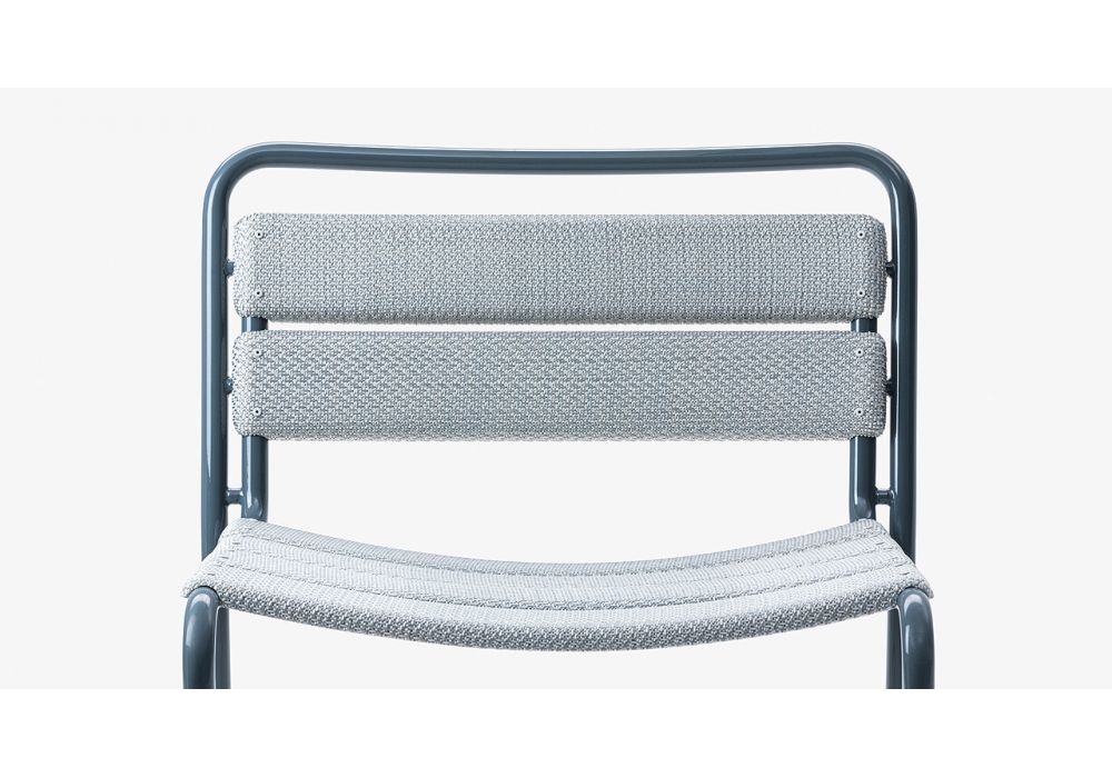 Elba diseñado por David Rockwell para Paola Lenti es un taburete con estructura en acero inoxidable AISI 316 mate pintado en grafito o marfil. Las lamas son de Diade revestidas en tejido Maris en dos acabados diferentes.