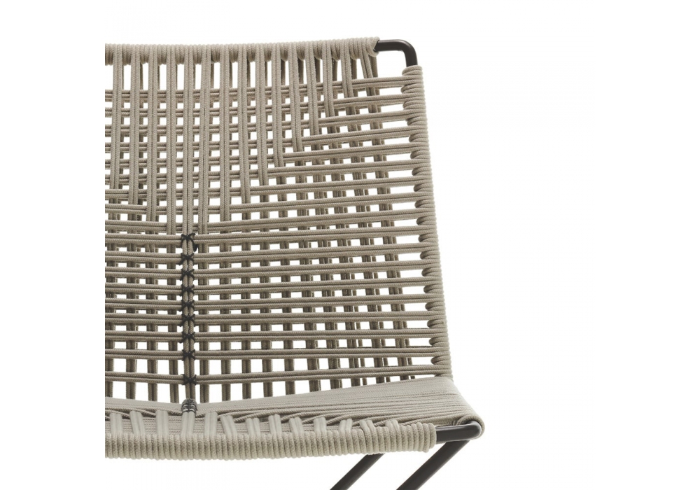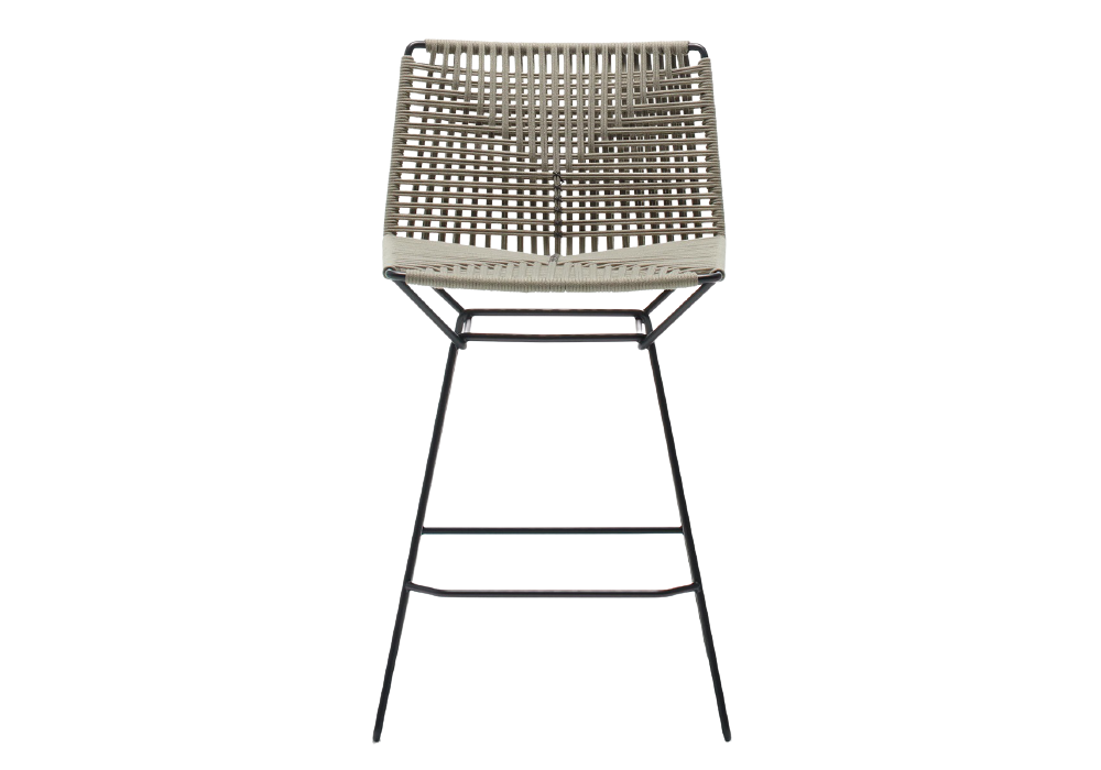 Neil Twist Ecrù diseñado por Jean Marie Massaud para MDF Italia es un taburete con estructura portante realizada en acero pintado negro plomo o blanco mate, asiento tejido con cuerda de poliéster gris crudo mate.