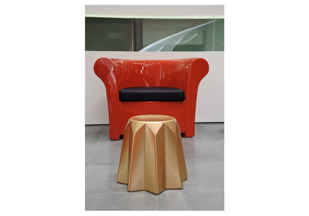 Pandoro diseñado por Gianni Arnaudo para Slide es un taburete original y divertido inspirado en la forma del famoso postre veronés con una base en forma de estrella de ocho puntas. Disponible en diferentes acabados