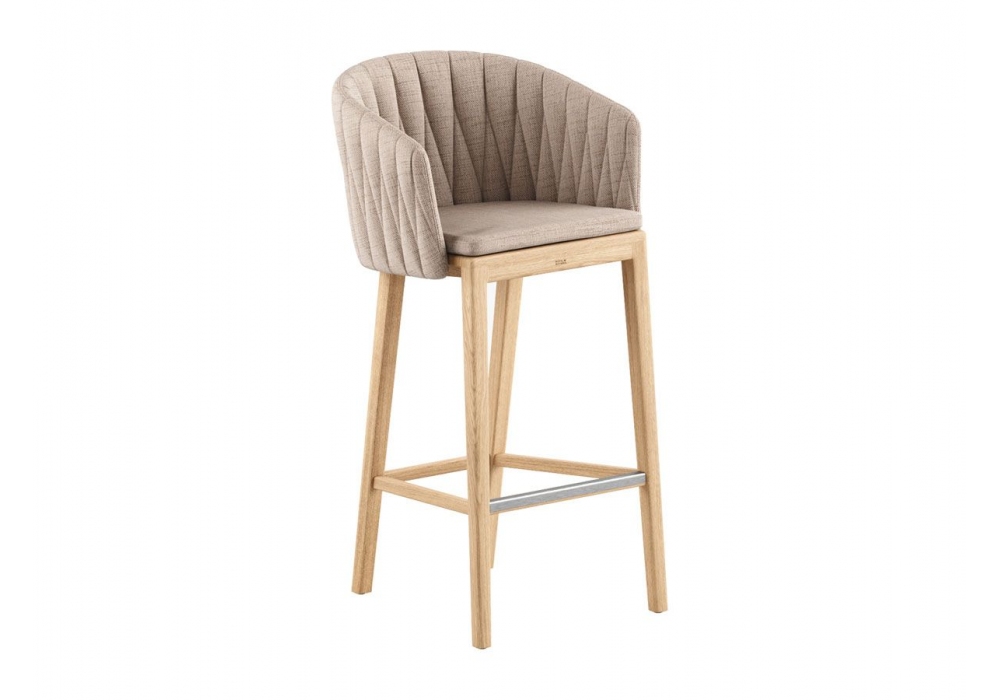 Calypso diseñado por Kris Van Puyvelde para Royal Botania es un taburete de exterior con cojines en diferentes acabados. Disponible en la versión con respaldo en tejido sintético y en diferentes alturas de asiento.